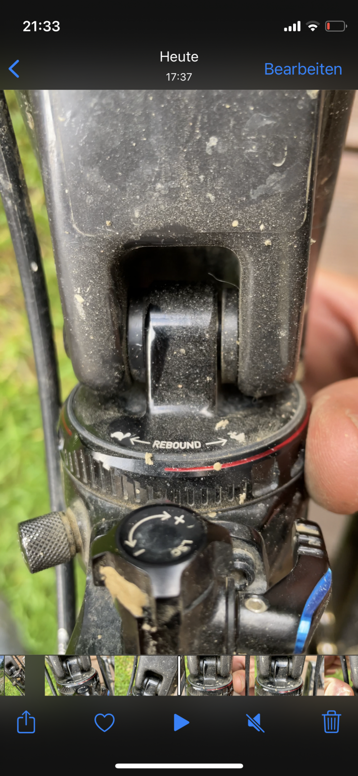 Ursache für das Knarzen scheint die obere Dämpferbuchse (Fox Float DPS Performance Dämpfer) zu sein, siehe Bilder. Es ist erkennbar, dass die Drehbewegung scheinbar aktuell zwischen Schraube und Aluminiumhülse stattfindet, was sich durch die starken radialen Riefen an der Schraube zeigt. Die Aluminiumhülse zeigt stirnseitig ebenfalls Riefen. Beide Teile würde ich aufgrund der Verschleißerscheinungen erneuern.
