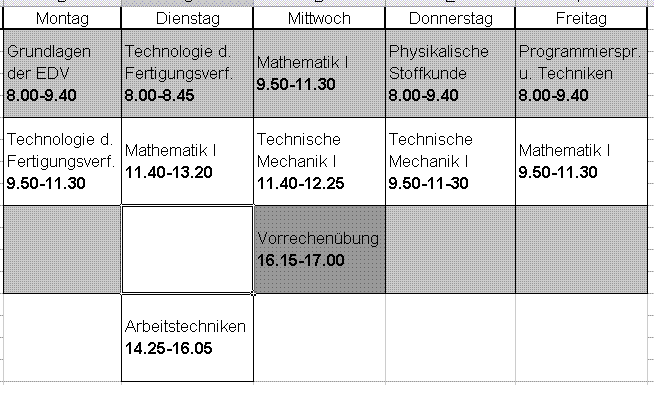 Dürften aber hoffentlich bald wieder frei sein.Onkel_Fungus schrieb:Also wir hatten damals (2002) keine Vorlesung während der OE. ICh glaube auch nicht, dass es jetzt so ist. Wäre ja total bescheuert. Mein Stundenplan sah damals so aus, wie auf dem Bild zu sehen und eigentlich ändert sich da nichts. Was Davon jetzt Übungen und wa Vorlesungen waren, weiß ich nicht mehr genau. Donnerstag von 8.00-9.40 kannst du dir eigentlich auch schon als frei markieren. Die Berger ist so schlecht, da geht man schnell nicht mehr hin, wie hier ja schon irgendwo gesagt wurde.