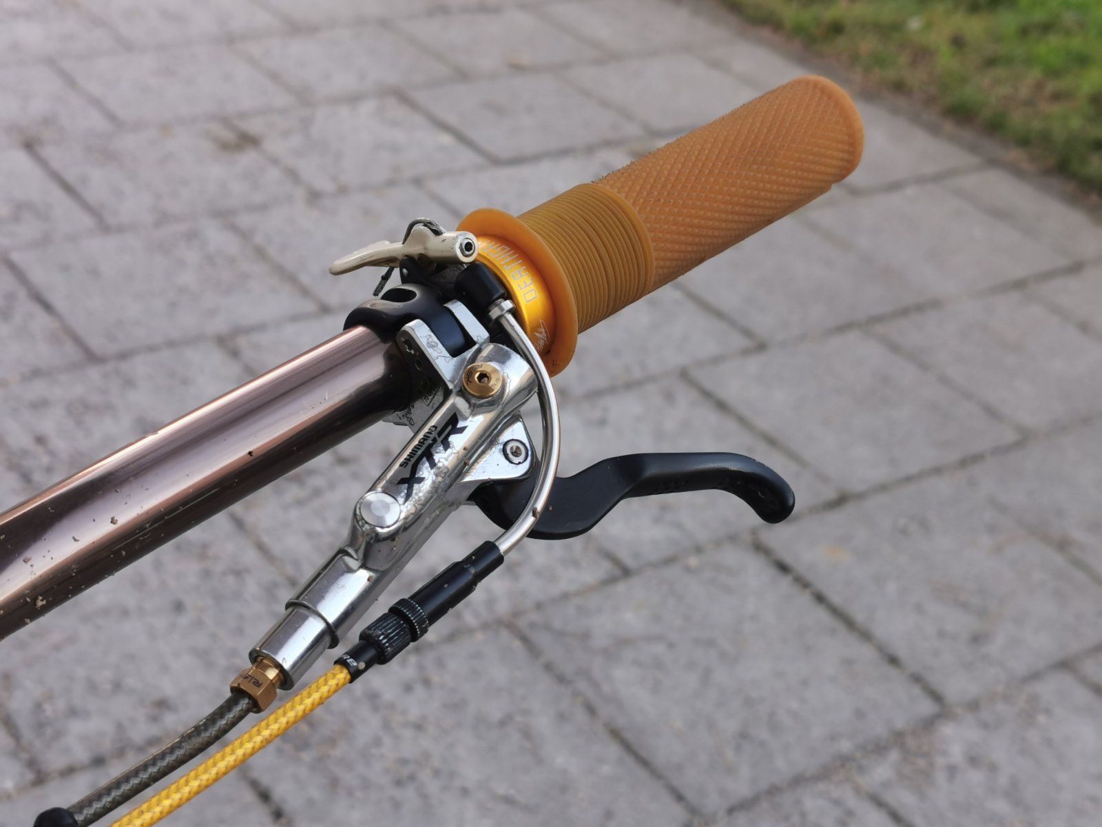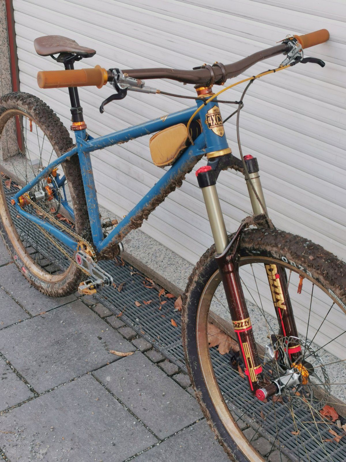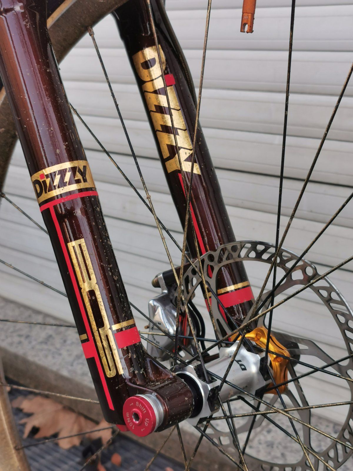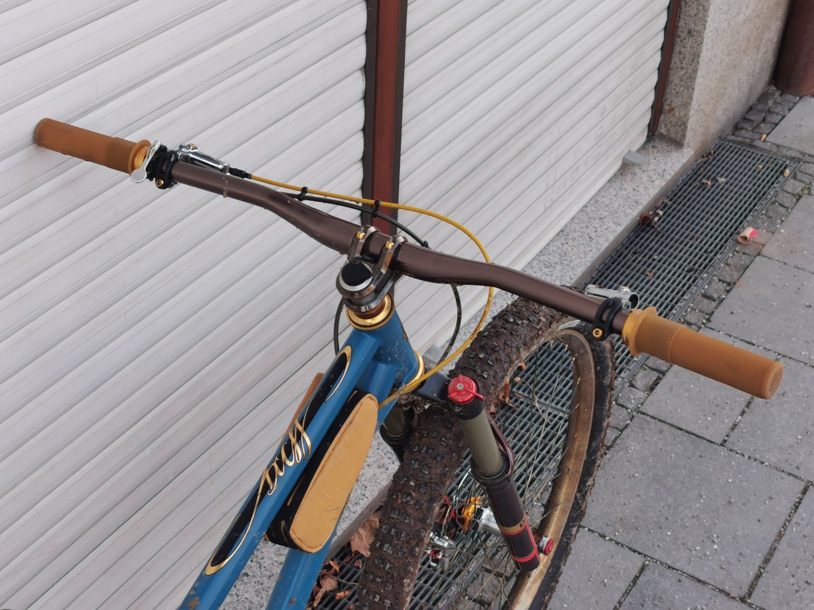 - gabel: BOS dizzy 27,5" mit 140 mm federweg, shift-up tuning-achse mit custom versteifungshülse, lackiert in candy schokobraun mit custom decals in rot matt und hammerschlag-gold, titanschrauben an leitungsführung und achsklemmung,