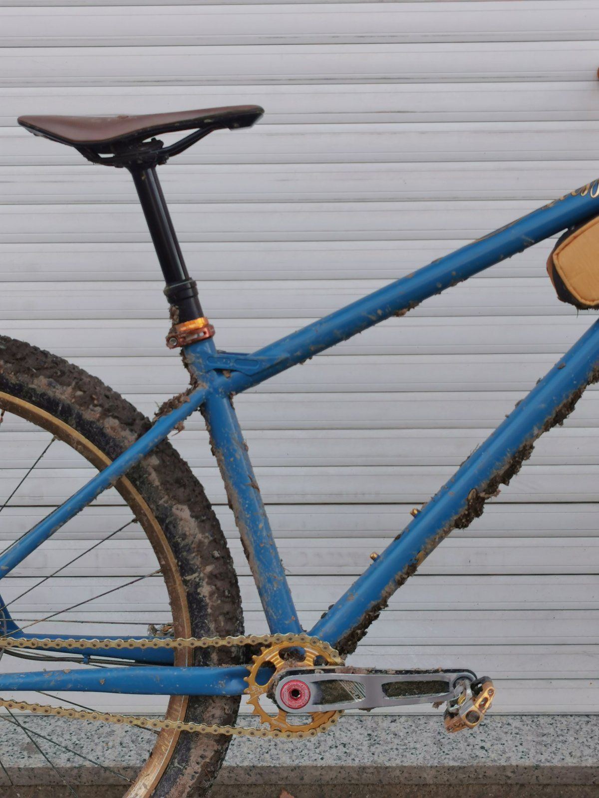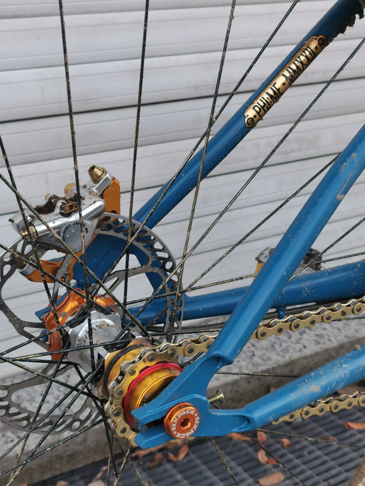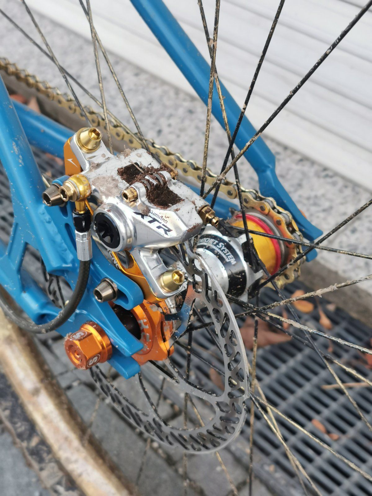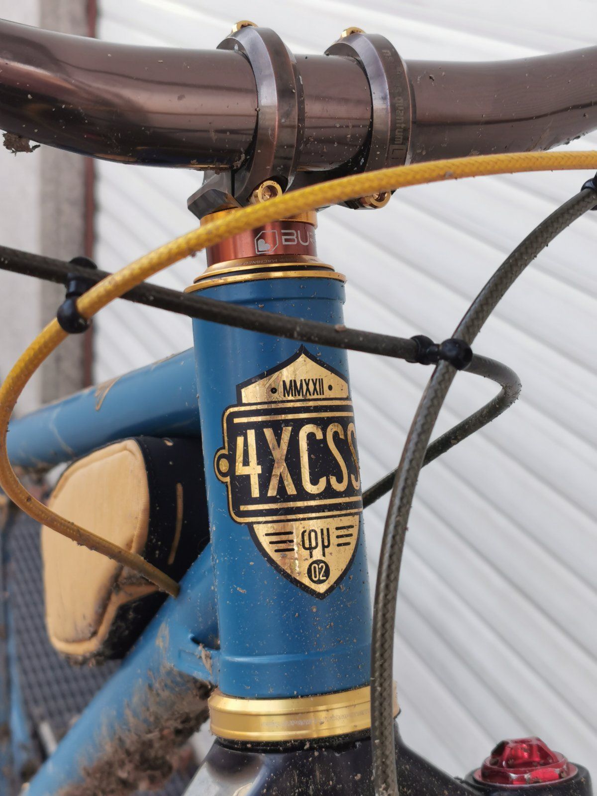 - gabel: BOS dizzy 27,5" mit 140 mm federweg, shift-up tuning-achse mit custom versteifungshülse, lackiert in candy schokobraun mit custom decals in rot matt und hammerschlag-gold, titanschrauben an leitungsführung und achsklemmung,
