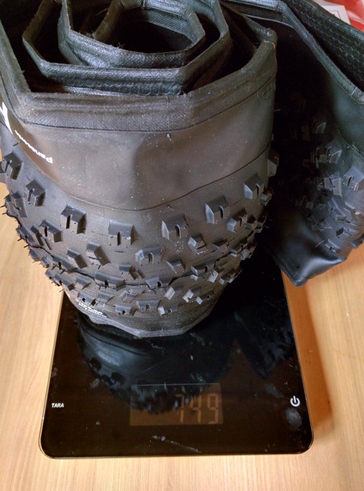 Fettes B: heute ist der Panasonic Fat B Nimble eingetrudelt! Er ist eher ein Schmalspur 29+ Reifen. Das Gewicht ist gering, die Waage blieb bei 749g stehen! Hab ihn auf die Hugo 52 aufgezogen: Breite Casing 71mm, Breite Noppen 66mm. Aussen-Durchmesser 760mm.