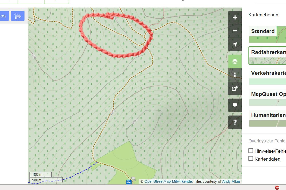 Das heftige Stück, wo wir auch teilweise geschoben haben, ist genau vor und nach der 1300er Höhenlinie. Der Bereich im roten Kringel ist human, also noch ohne Probleme fahrbar.