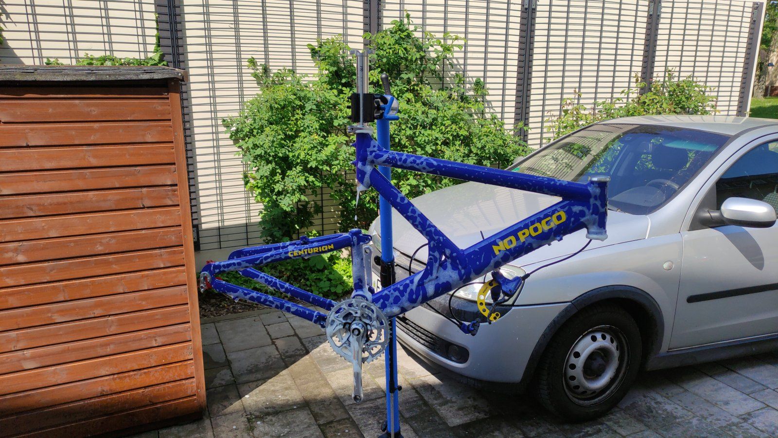 Die Idee mit dem "Kennzeichen-Blau" war gut aber leider nicht erfolgreich. Das Blau des Rahmens ist deutlich kräftiger und dunkler. Ich muss mich wohl mal in der Lackiererei mit den Farbkarten an den Rahmen setzen und vergleichen.