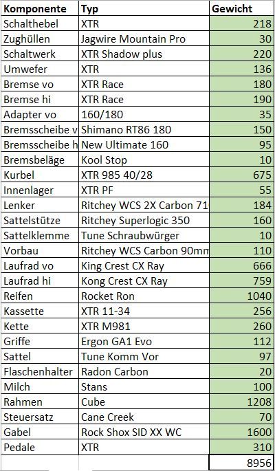 Sram X0 2x10 komme ich auf rund 9.5 kg, mit XT 1x11 inkl. XT