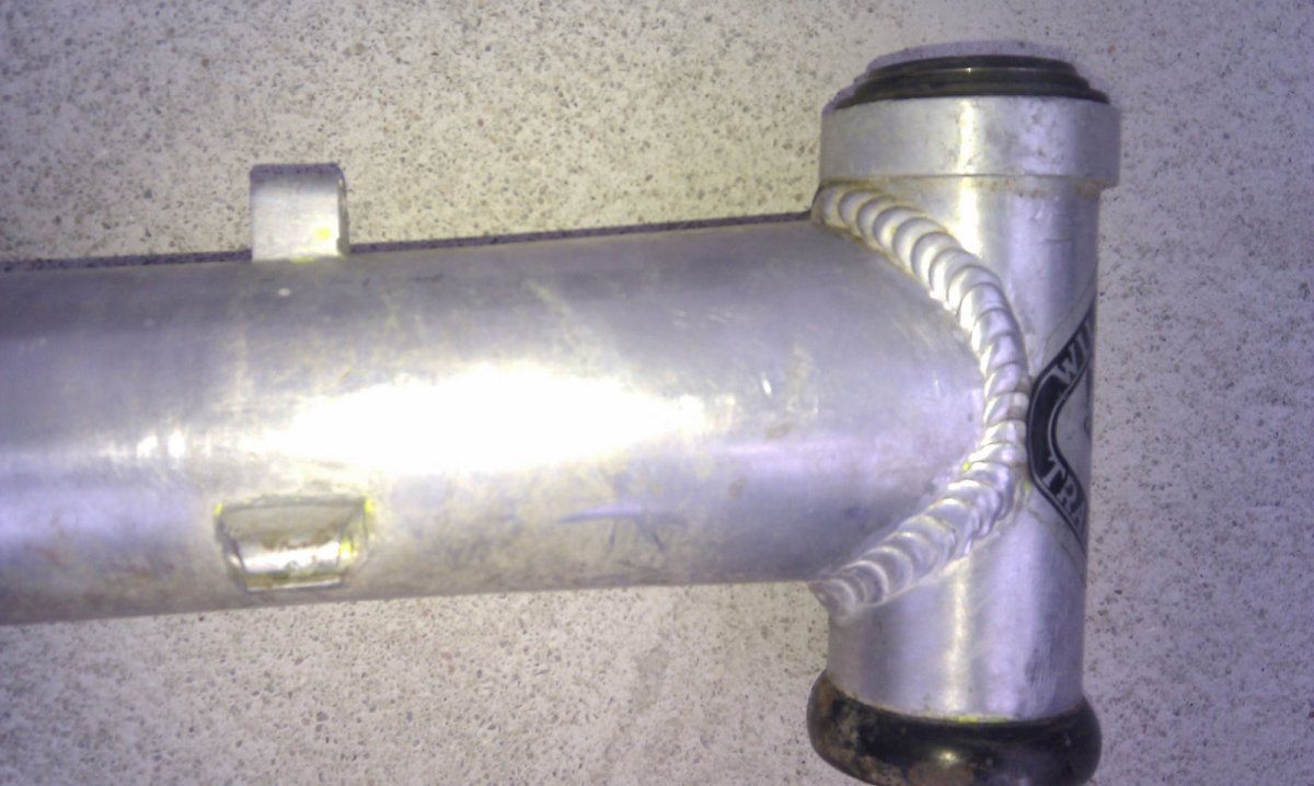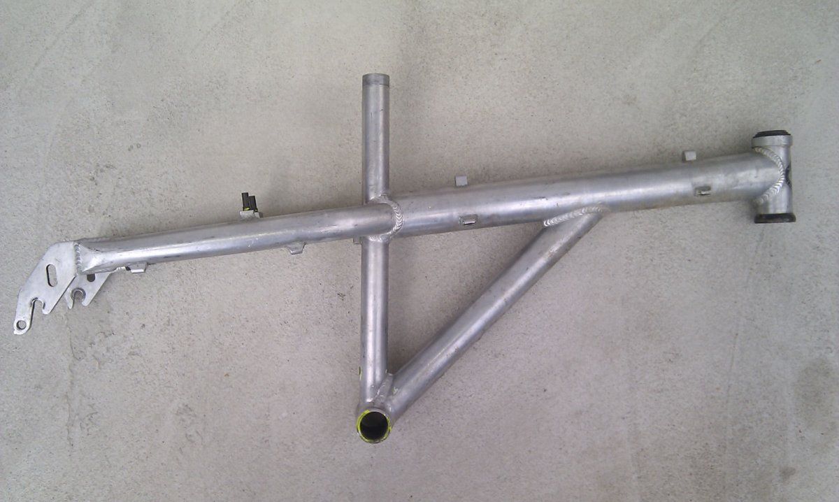Hier noch mal ein paar Detailaufnahmen. Ist entlackt, war vorher so was wie neongelb, Der Aufkleber am Steuerrohr scheint auch nicht original?