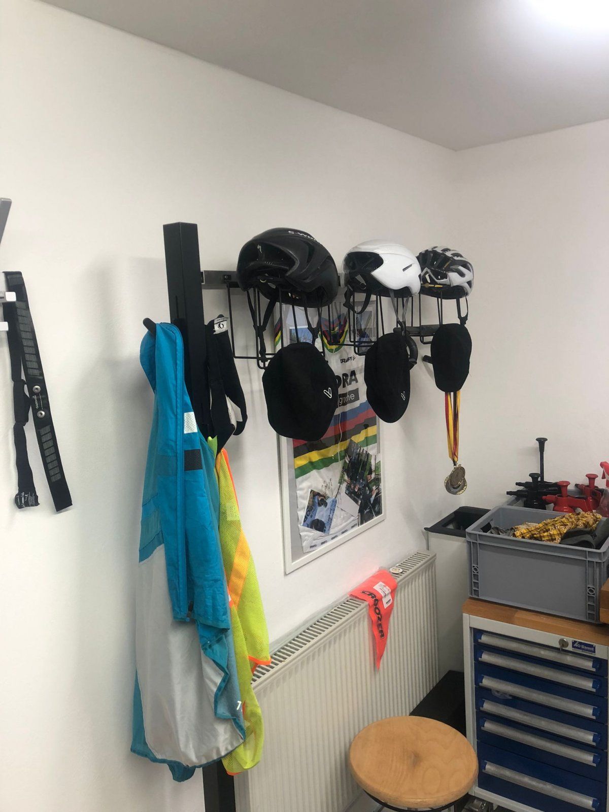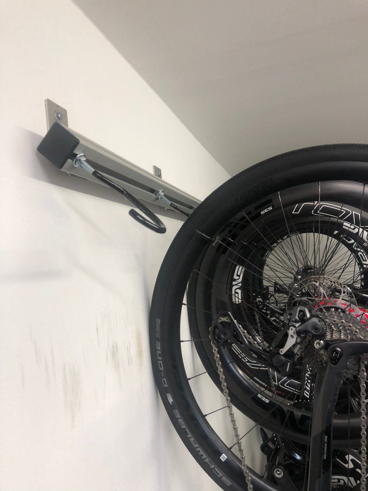 Hängend unter der Decke, an den Raumenden und wild inneinandergehakt, sodass das Herausnehmen eines Rades immer richtig kacke ist.