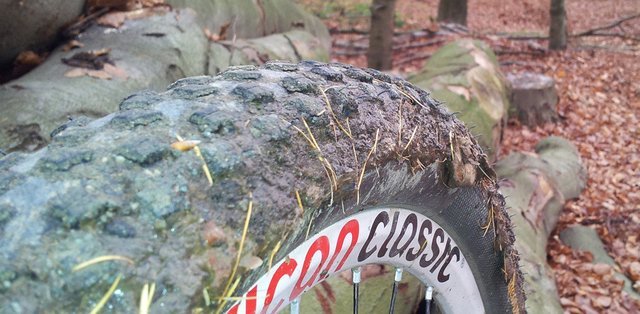 kaum noch Profil auf dem Reifen, aber selbst das setzt sich zu
