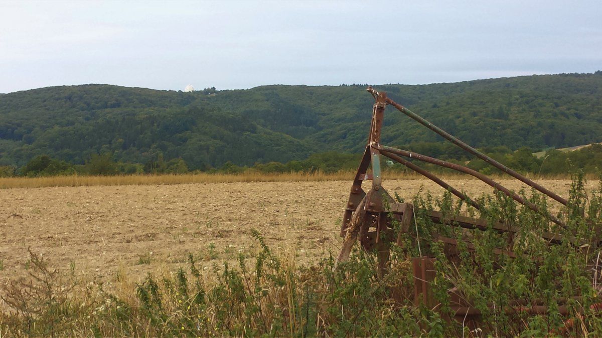 Vor nen 30cm dicken Baumstamm, der von Kettenblatteinschlägen gezeichnet ist, haben paar Jungs nen passenen Stein gelegt, dass man den Baumstamm ganz einfach überrollen kann