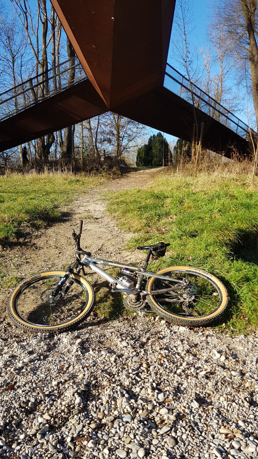 Mein Mitfahrer auf einem einigermaßen modernen Radon Slide 150 27,5er ebenfalls in L, welches glatte 20 (!) cm länger baut als mein Alteisen, hatte trotz besserer Bereifung (Baron v+h) in den feuchten Abfahrten das Nachsehen. Bergauf sowieso.