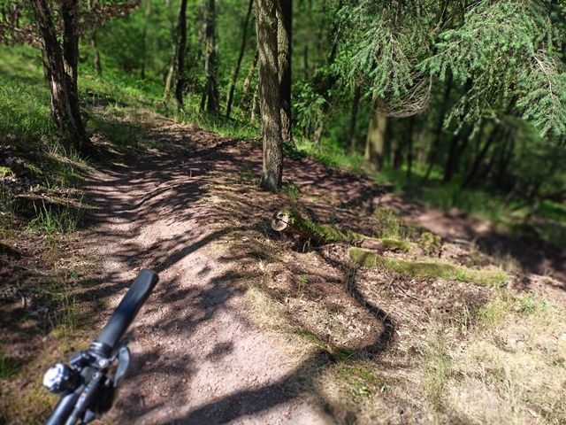 Es ist nur konzequent. Reifen breiter, Lenker breiter, Hose alles breiter als damals. Die Forstverwaltung läuft ganz genau mit dem Trend.Das ist aber ein breiter Singletrail!