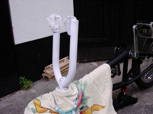 So, bin heute noch am Kurbel lackieren, die Gabel ist schön geworden, der Vorbau auch, am Lenker ist leider vom Einbau schon wieder eine Macke drin, aber naja, ist schleißlich ein Gebrauchsgegenstand. Ein weißer Lenker ist übrigens arg gewöhnsbedürftig. Die grundierung lass ich noch bis heute Abend trocknen und dann kommt schwarz auf die Kurbeln.