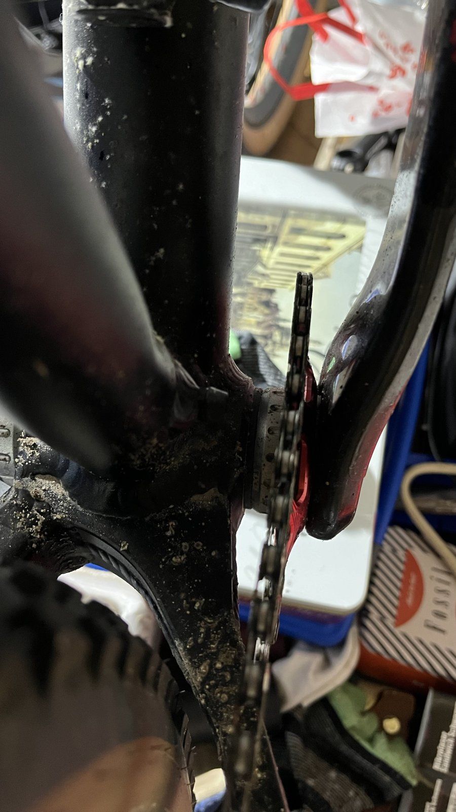 Ich weiß ehrlich gesagt nicht, bis zu welcher Reifenbreite das wirklich funktioniert, einerseits sind die Kettenstreben begrenzend, andererseits aber auch ggf. der Umwerfer bei 2x9.