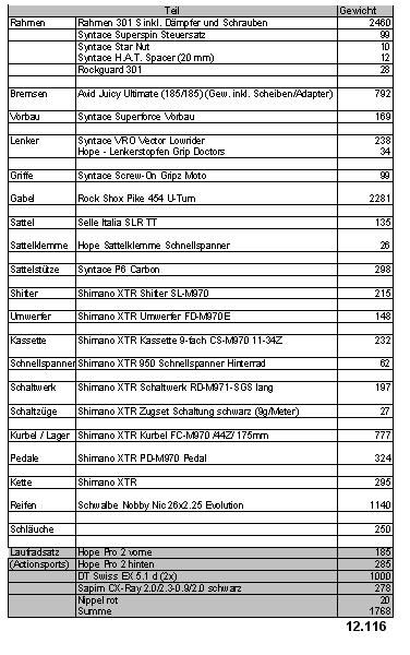 Hier ist mal meine Teileliste inkl. Pike. So langsam freunde ich mich damit an, da ich eigentlich nichts Negatives über diese Gabel höre.