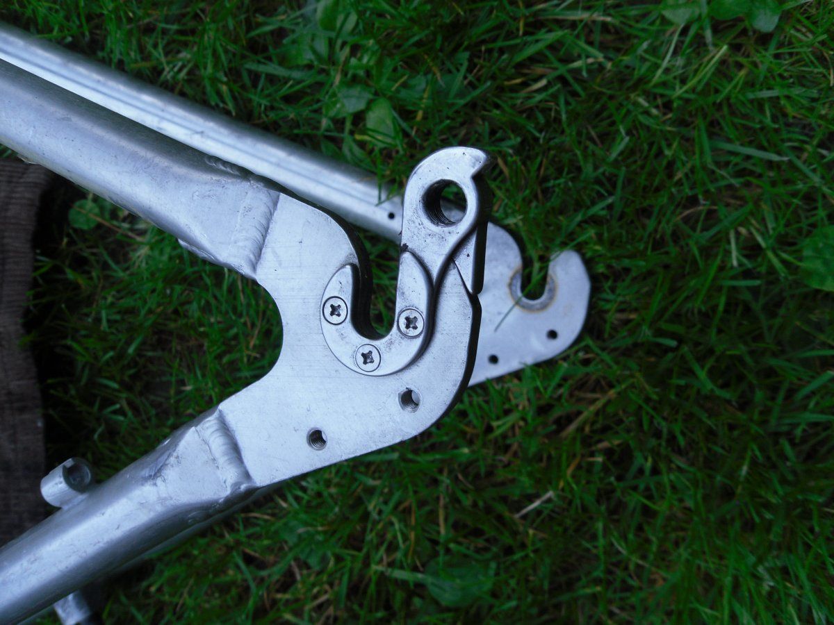 Der Rahmen war original Alu natur mit Klarlack, wurde aber von einem großen Künstler im Bereich von Oberrohr, Sattelrohr und Unterrohr mit weissem Sprühlack "veredelt". Dieser lässt sich teilweise gut abbürsten, teilweise nicht, so dass Abbeizen/neulackieren/Neubeschichten sinnvoll wäre. Oder man baut sich eine solide Stadtschlampe.