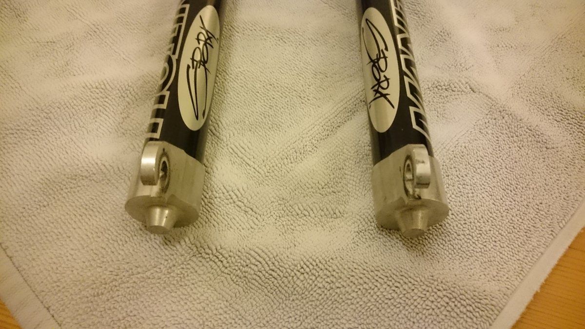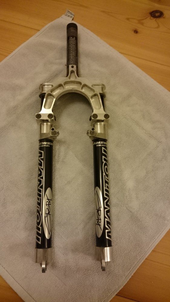 wie versprochen endlich Fotos und Maße. Zuerst: meine Manitou Sport Federgabel. 1 1/8 Zoll, 145 mm Schaftlänge. Wie bei allen Manitous hat es die Elastomere zerbröselt. Ansonsten sieht die Gabel dem Alter entsprechend gut aus.