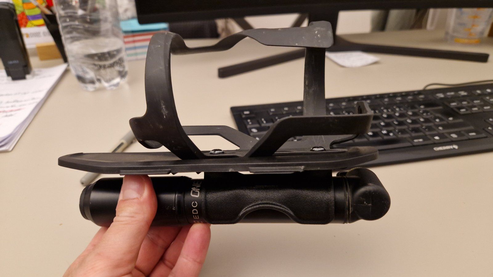 Zitiere hier mal meinen Post ausm Stumpi Evo thread. Meine Lösung mit dem neuen Rad sieht mittlerweile so aus wie oben.Für alle die ne oneup Pumpe mit Tool (oder auch ne andere Pumpe) benutzen.