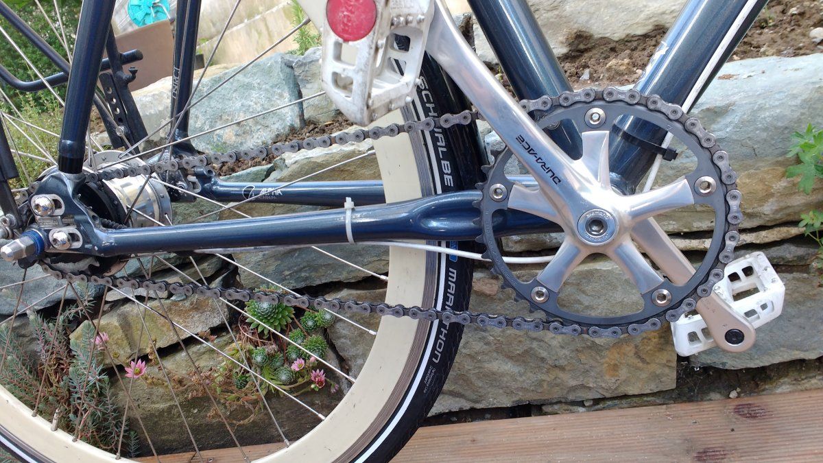 Shimano Alfine Inter 11 Nabenschaltung verpasst. Diese wurde in die original Felge neu eingespeicht. Bei dieser Gelegenheit wurde auch die original Kurbelgarnitur gegen eine Dura Ace getauscht, die mir deutlich besser gefällt.