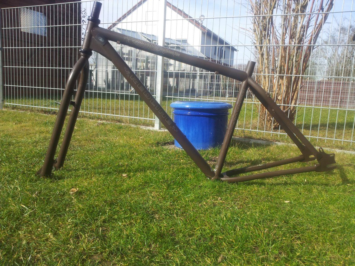 Dazu muss ich sagen der Rahmen ist kein Meisterwerk der Schweißkunst, da das Hinterrad, wenn es bis zum Anschlag in die Ausfallenden geschoben wird nicht 100% gerade steht. Das kann ja dank der horizontalen Ausfallenden leicht geradegestellt werden und ich hatte auch nie Probleme mit mangelndem Geradeauslauf oder Gleichgewichtsprobleme beim freihändig fahren.