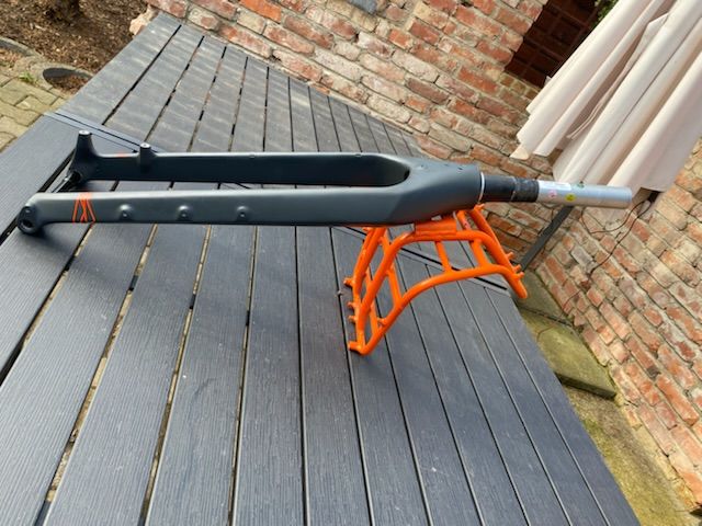 Der Rahmen hat keine Dellen, Risse, kein Rost, Lack mit div Gebrauchsspuren. Steuersatz und Gabel haben max 250 Km drauf!