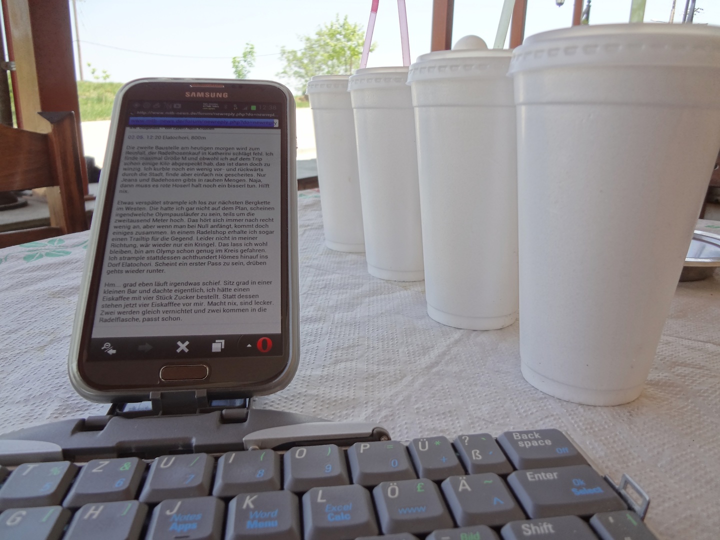 Donnerstag 24 Uhr: Neueinrichtung mit Software halbwegs abgeschlossen. Gigabytes an OSM-Karten heruntergeladen, Telefon gerootet, Adblocker, deutsche Tastaturtreiber für das Faltkeyboard, EyeFi-Software für die drahtlose Kamerakommunikation, Editoren, Bildbearbeitung, was man eben so braucht. Note 2 rennt wie Sau, schnellerer Prozessor und vor allem mehr RAM machen sich deutlich bemerkbar.