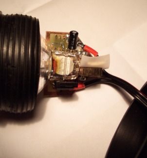 Die Lampe ist direkt mit der Platine verschraubt (2 Messingsockel), diese sorgen für einen guten Halt und Kühlung. Auf der Platine ist ein Taster gelötet, der durch eine kleine Taste (TV-Fernbedienung) mit der Außenwelt verbunden ist. Die Kabel gehen direkt aus dem Gehäuse zum Akku.