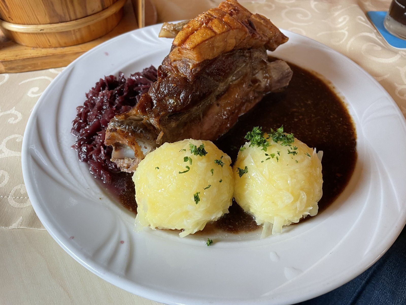 Habe heute meine Familie zum „alten Wirth“ nach Huglfing entführt. Da gab es dann ein“knuspriges Schäufele mit Blaukraut und Thüringer Kartoffelknödel“.