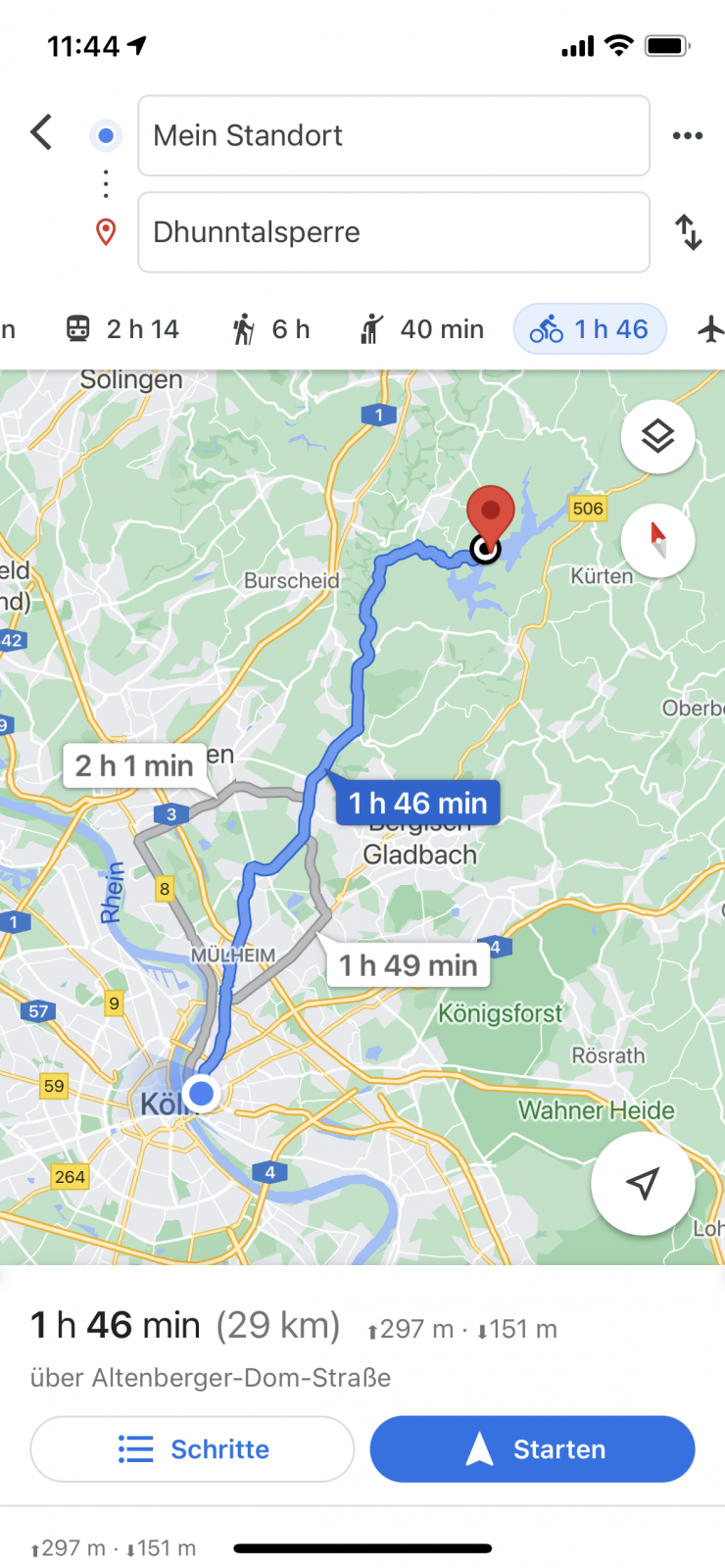 Es ist halt ca. 30 km von Köln entfernt. Bis ich dahin geschafft habe, dann noch bergauf und -ab...Hatte noch kein Wasser dabei. Die letzten 2 Stunden waren dann echt schlimm 😱