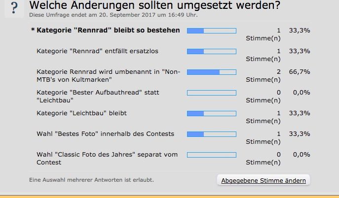 Ich für meinen Teil kenne einige Treads hier, die ich äusserst inspirierend fand. Und die ich gerne gelesen habe. Obwohl die Räder im Contest dann keine Chance hatten. Oder gar nicht erst nominiert wurden.