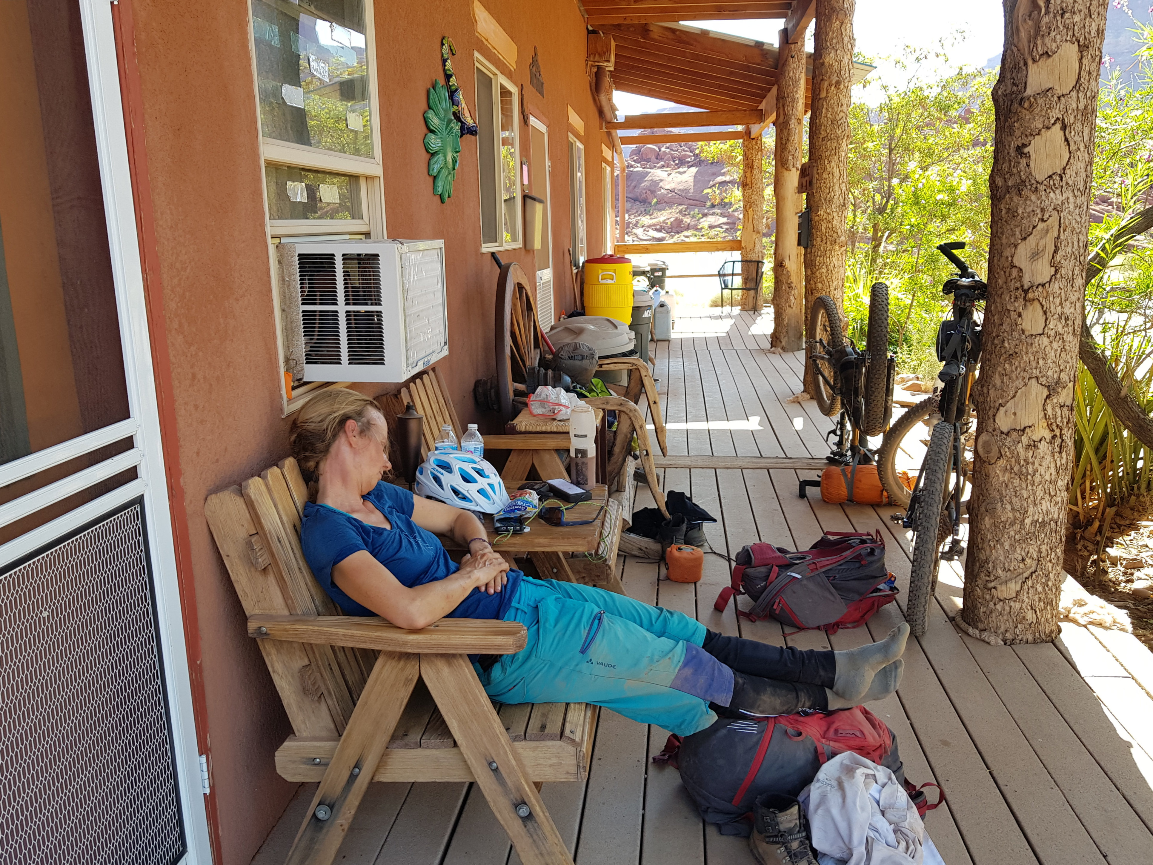 Ja und dann?! WTF?! Kaum ein halbes popliges Stünderl hinter unserer mit viel Eigenblut und andauerndem Juckreiz erkauften Colorado-River-Moskito-Schlammsauf-Aktion finden wir plötzlich einen Wegweiser: "Adventure Basecamp Lodge". Karamba... wo kommt die denn auf einmal her, mitten in der Pampa am Ufer des Colorado, einen Fünfhunderthöhenmeterpass und drei ATV-Stunden von Moab entfernt?! Keine Ahnung hatte ich, da kommt man sich dann doch ein wenig blöd vor. Aber OpenStreetMap ist in den USA halt mal ne halbleere Katastrophe, die Tourbeschreibung verliert kein Wort darüber, erinnern vom letzten Trip kann ich mich an dieses Ding auch nicht. Ist zwar niemand daheim, aber die Türen sind offen, überall stehen "Welcome"-Schilder rum, Trinkwasserspender vor der Tür, ein Kühlschrank mit eiskaltem Bier in der Küche, beinahe wie eine Fata Morgana. Wir haben zwar den Bauch jetzt schon voll feuchtem Flussmatsch, trinken aber einfach weiter und hängen ne halbe Ewigkeit auf der schattigen Veranda ab.
