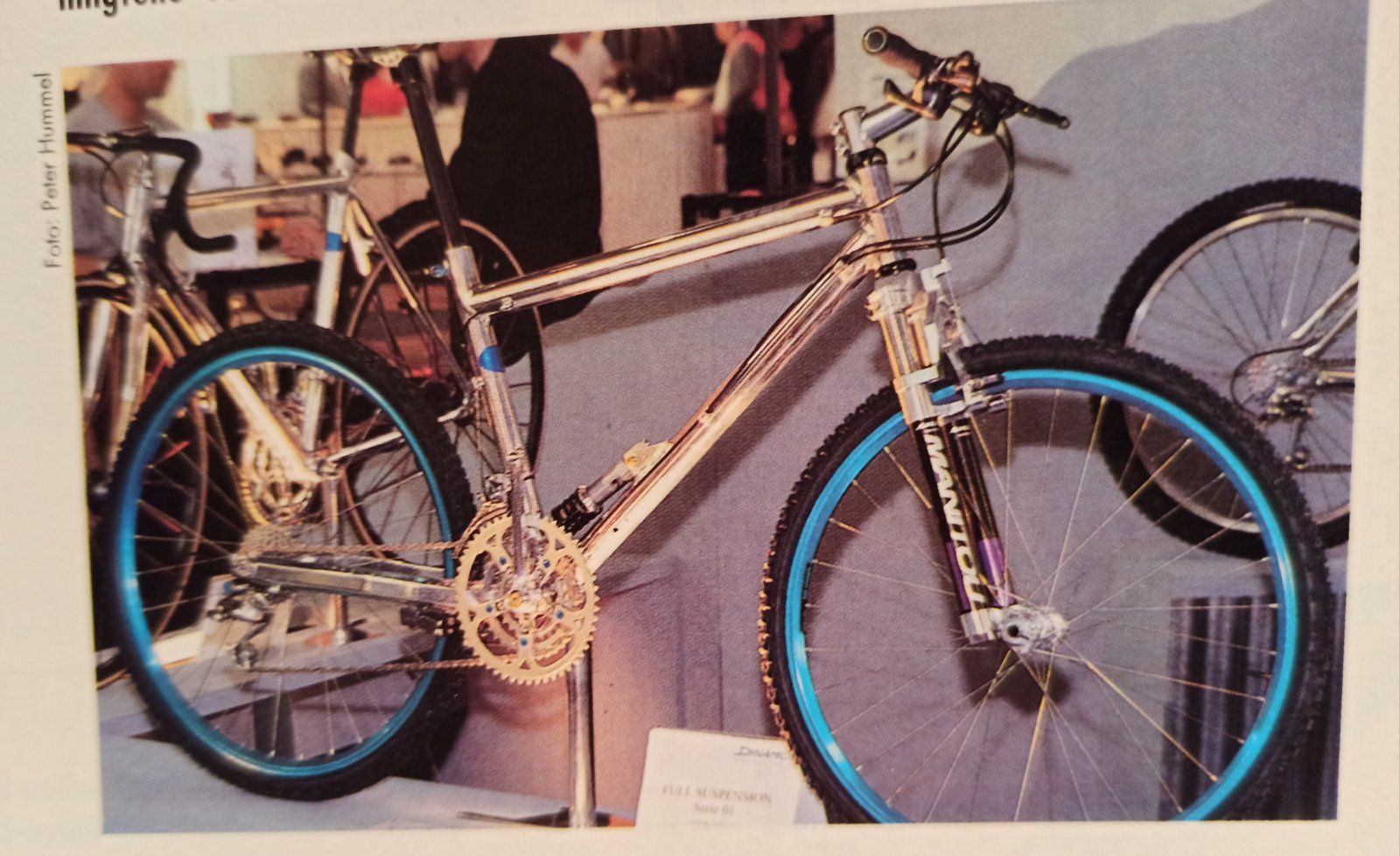 Ich habe ein ein dynamics Prospekt von ~1997. Aber selbst da ist kein foto vom Aufbau. In keiner Zeitschrift (bike, bike Sport news, Mountainbike) konnte ich ein Test darüber finden. Wird wenn dann immer nur kurz erwähnt bzw. Auch nur der Rahmen gezeigt. In den bike Markt ist nicht drin. Und im Workshop nur als Rahmen.original Werbebild