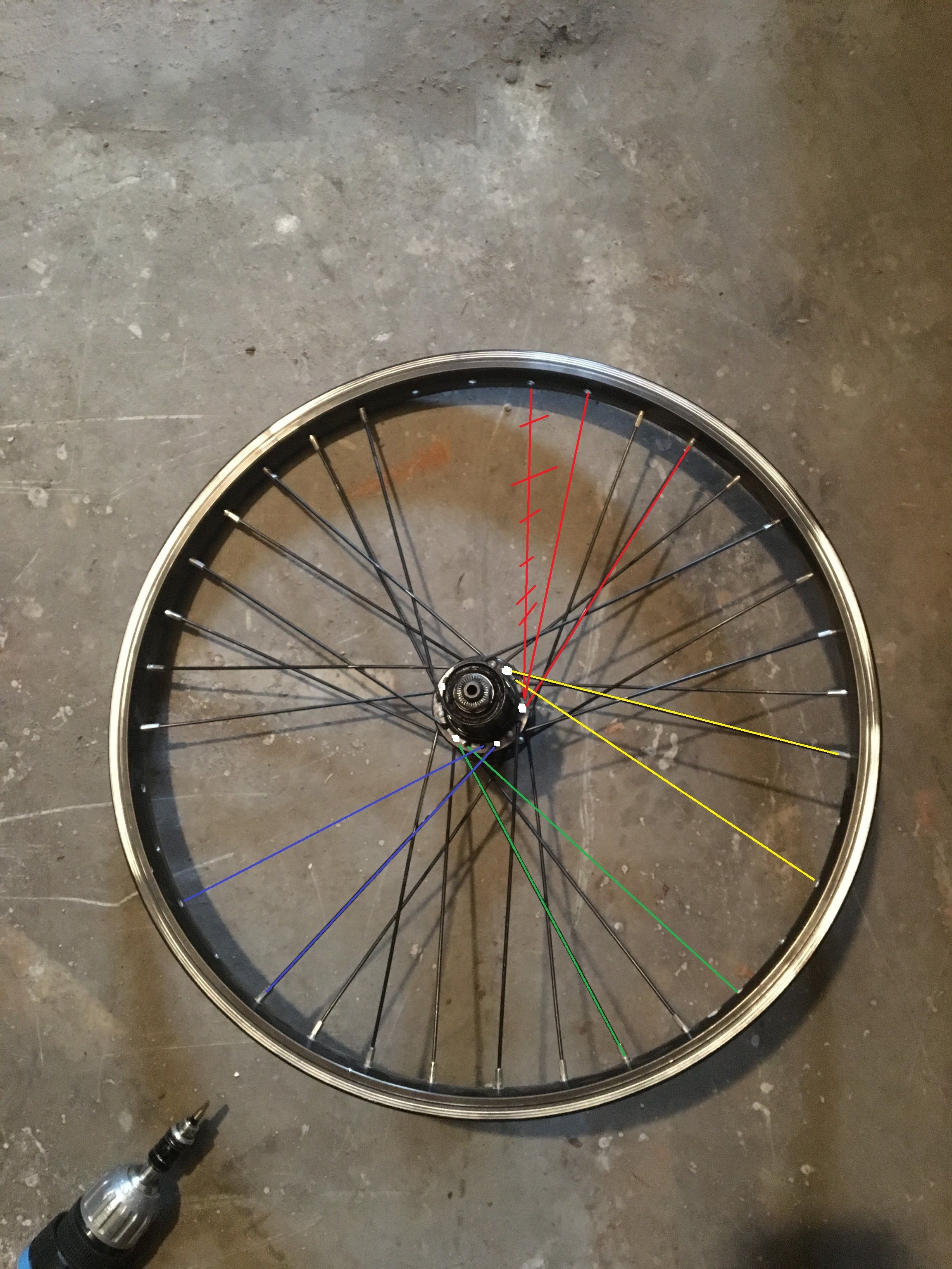 Überlegung, die Hälfte der Speichen dürfte reichen, dann eben 1x gekreuzt, statt 2x, was laut Speichenrechner die selbe Speichenlänge ergibt.