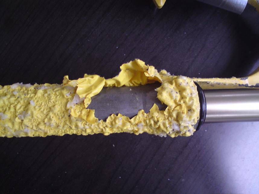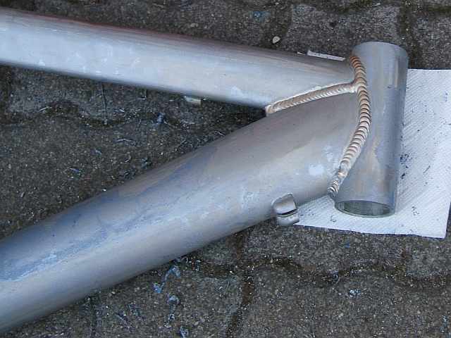 Und beim Strahlen ist es ja auch so, dass der Rahmen danach rauh ist. Mit Ausnahme der Macken, die ich rausgeschliffen habe, konnte ich nach dem Beizen gleich relativ feines Schleifpapier nehmen.