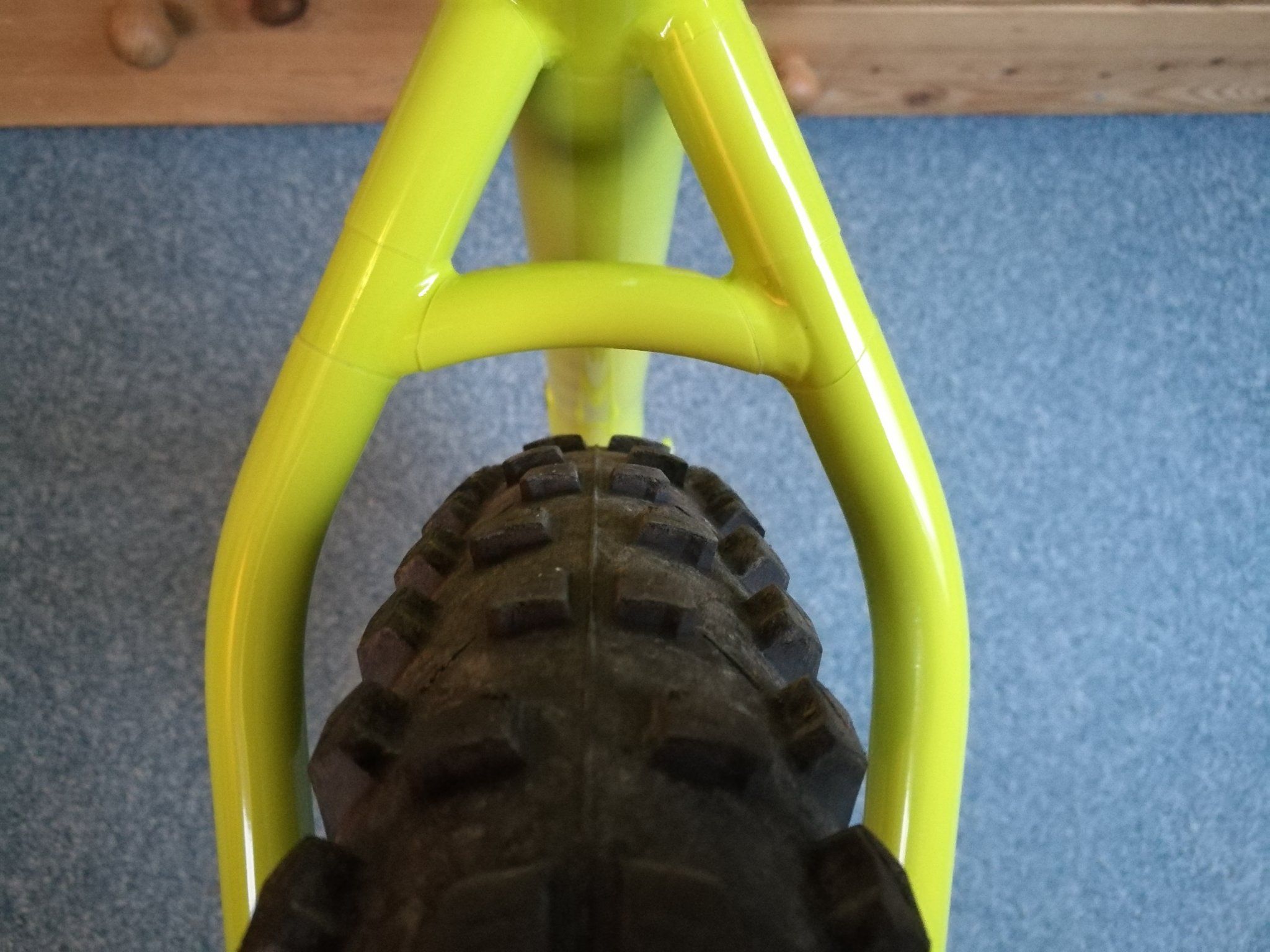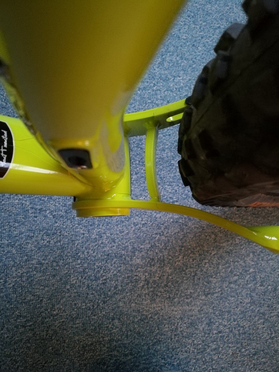 Das ist aber sehr liebevoll abgeklebt.Denke das wird nix mit den 2.6er Reifen. Hier mit nem 2.4er Baron auf 29 mm Maulweite, Kettenstreben sind auf maximaler Länge (auf mimimaler Einstellung liegt der Reifen am Rahmen an). An den Sitzstreben ist dagegen massig Luft.