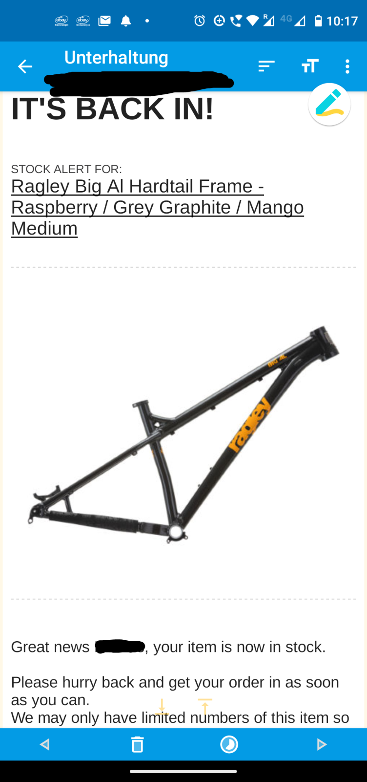 Hi @~joe~, hab gerade von Wiggle eine Notification bekommen, dass sie den Rahmen in M wieder reinbekommen haben. Musst aber wahrscheinlich schnell sein, das letzte mal, waren sie dann wieder am gleichen Tag ausverkauft.