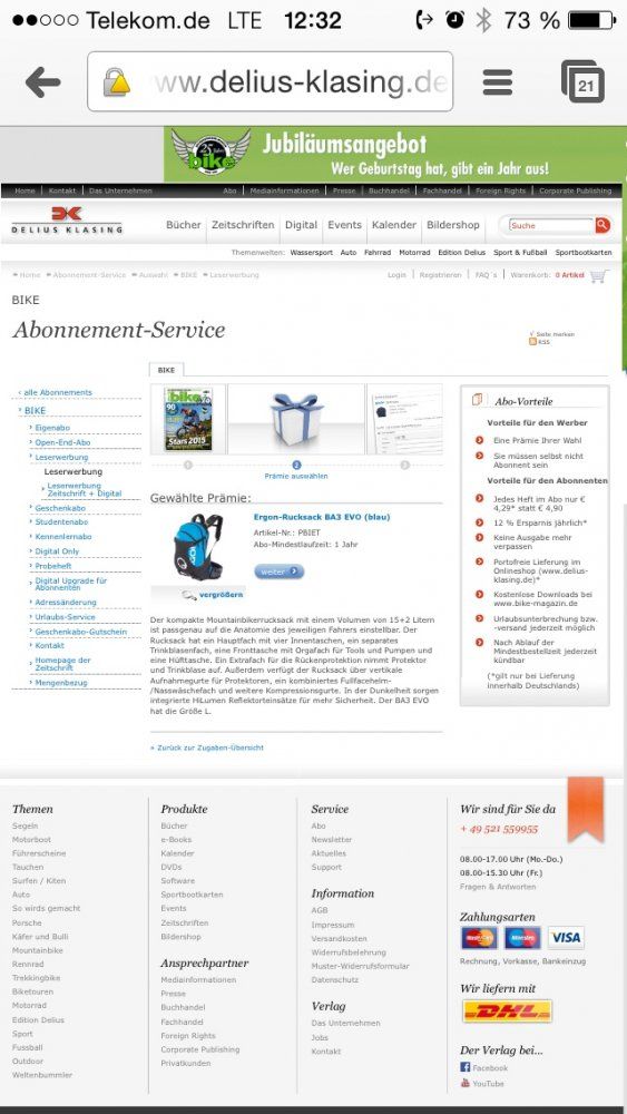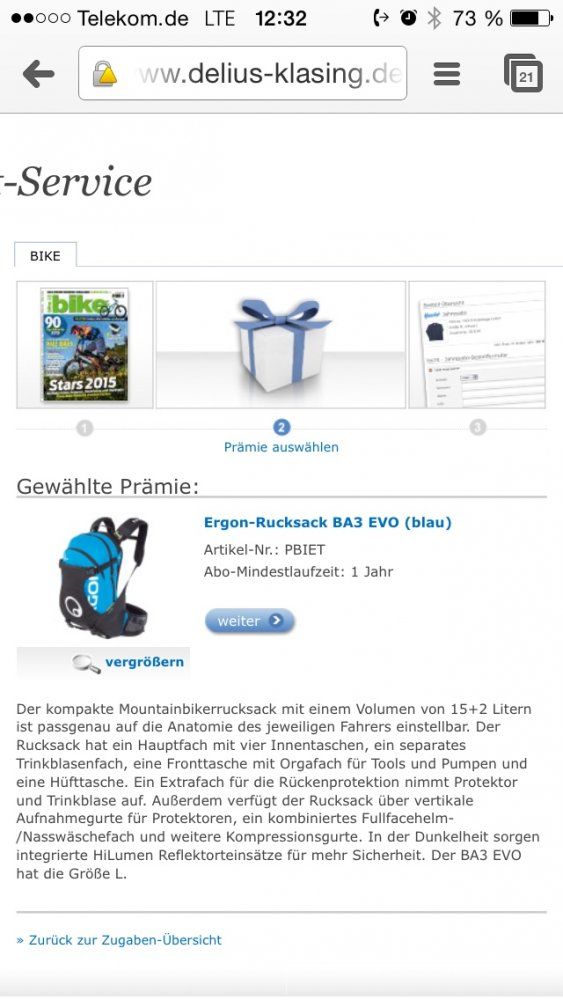 vielen Dank für Ihre Nachricht. FREERIDE erscheint 4x im Jahr zum derzeit gültigen Bezugspreis von 21,00 EUR. Den von Ihnen gewünschten Rucksack Ergon BA3 Evo bieten wir bei BIKE für Freundschaftswerbung an oder für ein Eigenabo mit einer Mindestlaufzeit von 2 Jahren, da dieser Rucksack einen Wert von 129,95 EUR (UVP) hat.
