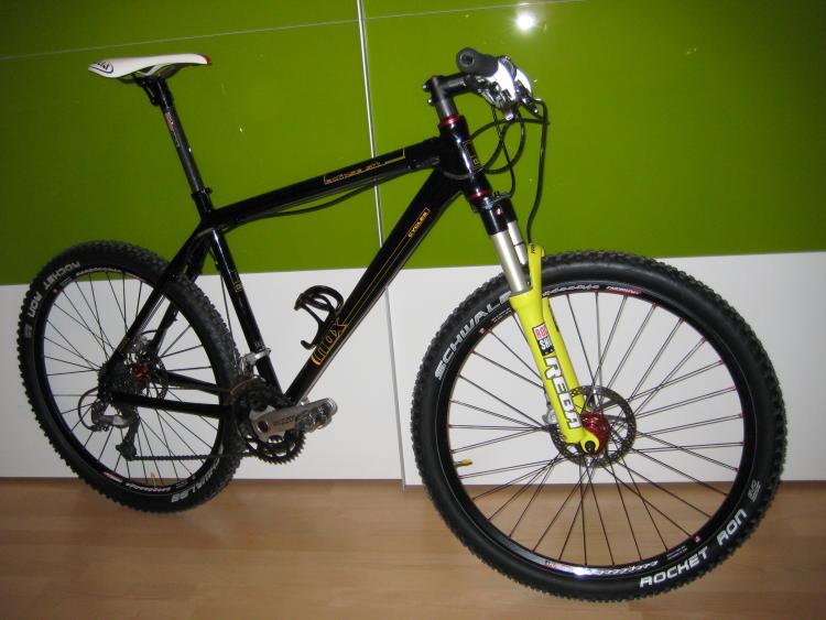 Basis ist der frühere Crossfire 2 Rahmen von Nox, den es leider nicht mehr gibt, und eine Vollkarbon Cross-Gabel (vermutlich Kuota Mud, bin ich mir nicht ganz sicher). Den Rahmen habe ich günstig als Auslaufmodell erstanden, er kostete mich nur etwas mehr als der Crossfire 1 (ohne Carbonhinterbau), die Gabel lag bei einem Bekannten im Keller rum.