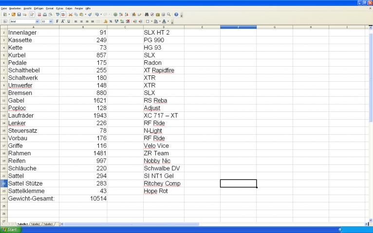 Die Bremsscheiben fehlen in der Tabelle, ebenso Züge, Spacer, Kettenschutz,Flaschenhalter, Tacho