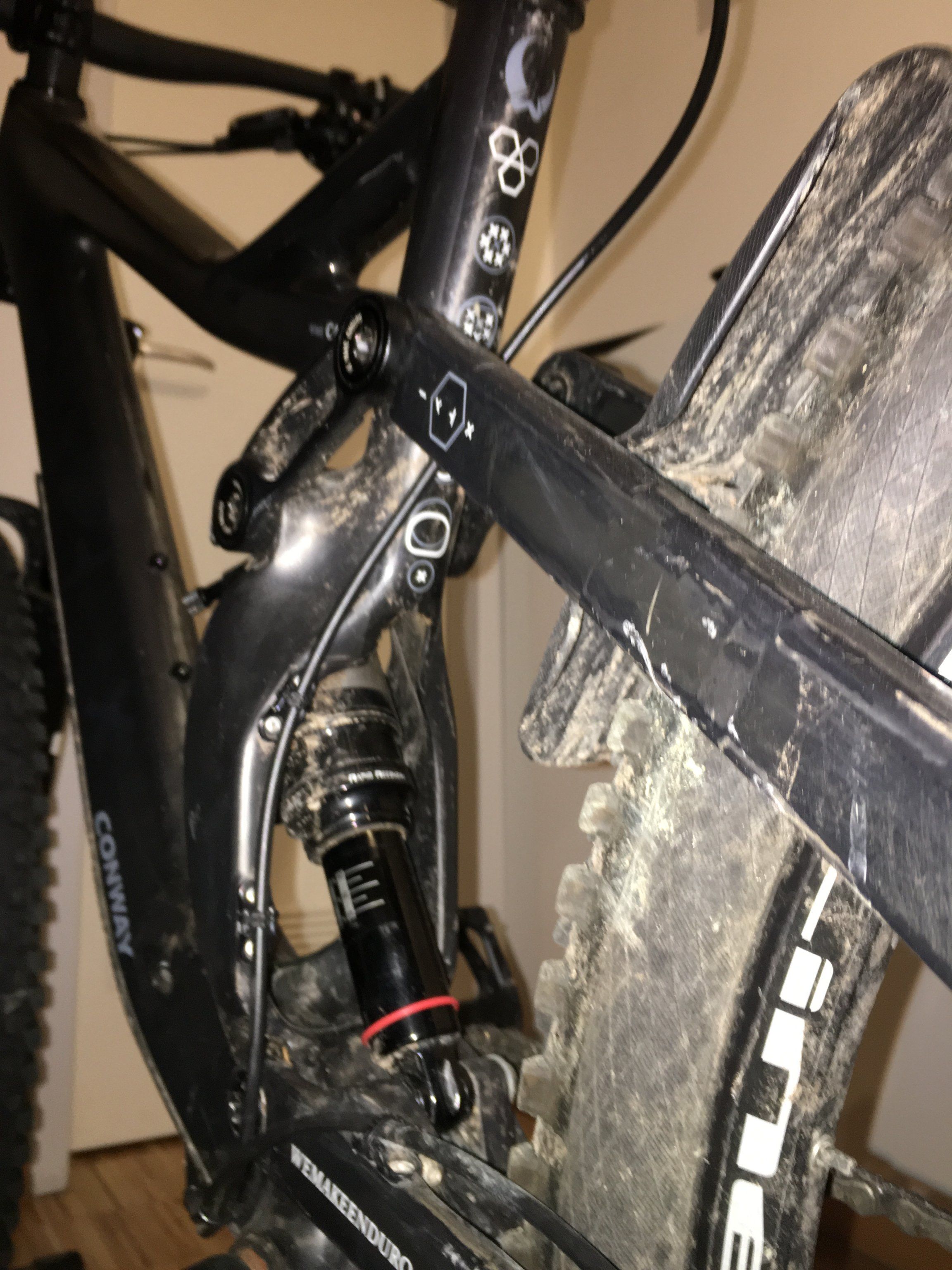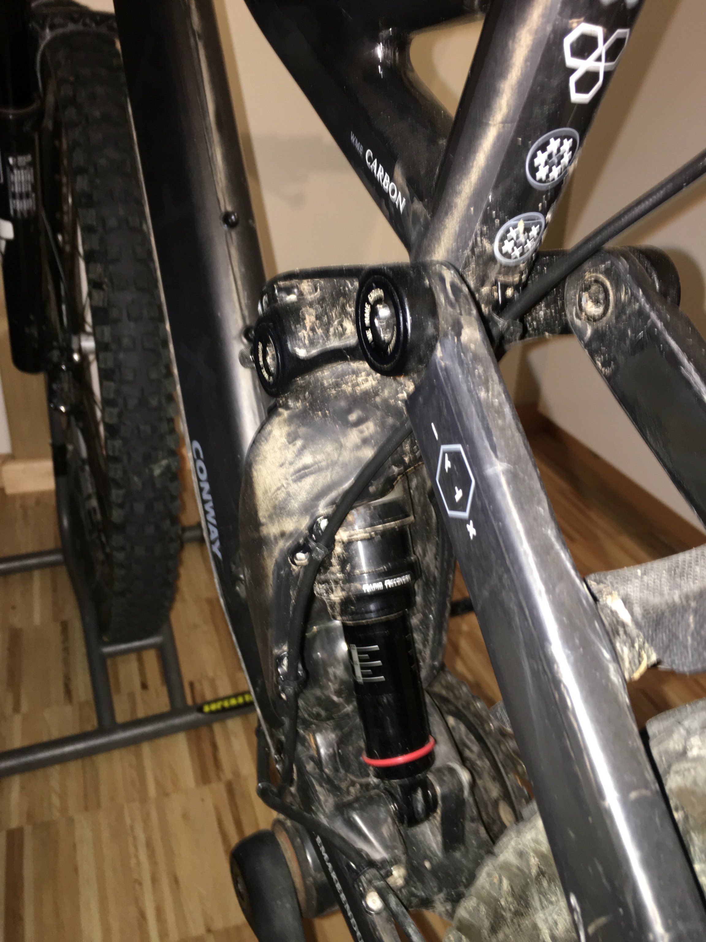 Beim Conway WME in Größe S, ist es nur so, dass es mit den 200mm Sitzrohrlänge schon arg knapp ist, weil dann ja auch noch die Anlenkung für die Remote kommt. Vom Ende des Sitzrohrs bis zum Dämpfer (der ja das Sitzrohr durchbricht) sind es dann nur noch so 5cm. Ich muss da mal die Luft komplett aus dem Dämpfer lassen, um zu sehen wie sich das verhalten würde beim einfedern.