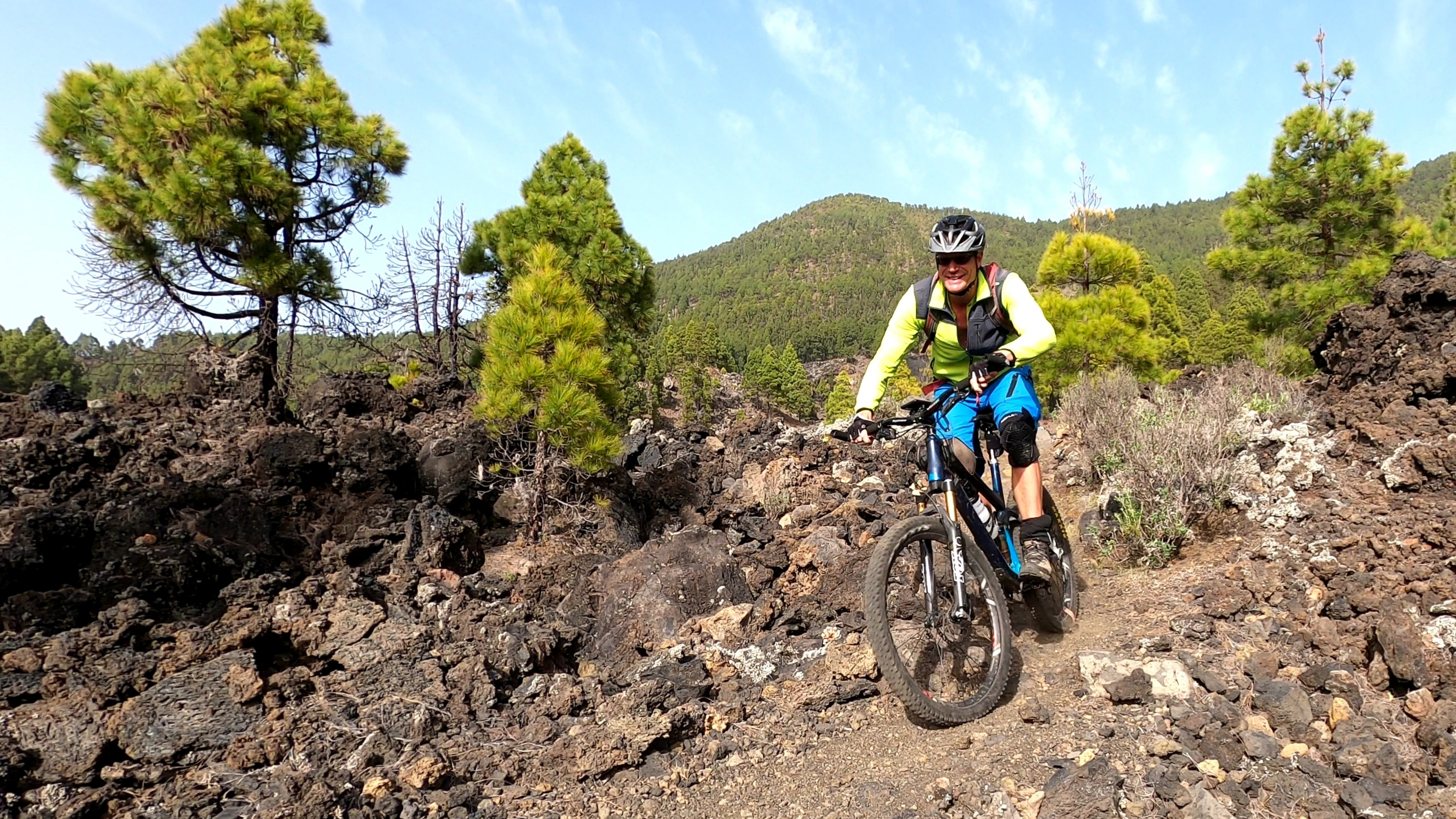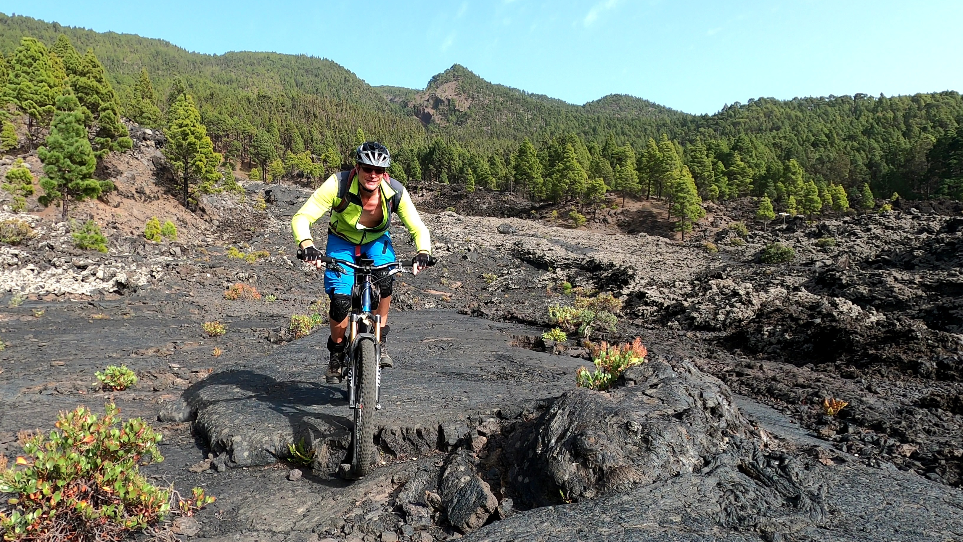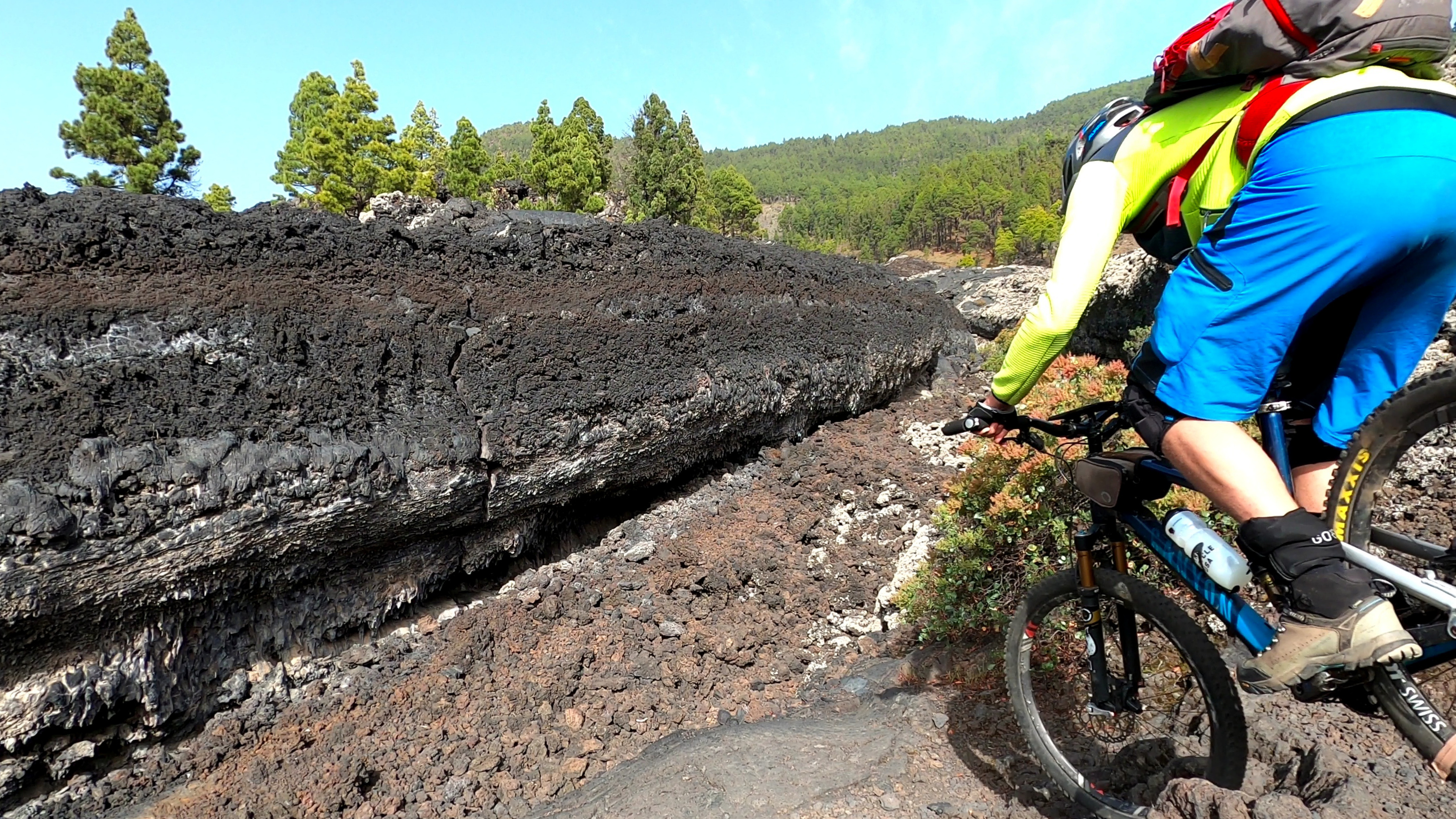 Heute auf dem Programm: PR-LP5 von der Roque-Muchachos-Straße hinab an die Ostküste nach La Galga. Die ersten paar Minuten sind ein bisserl holpriger, aber der ganze Rest ist ein einziges, elend langes Flowwegerl über zehn Kilometer und 1600 Tiefenmeter. In der ersten Hälfte fliegst du über Piniennadelwaldboden, später dann durch spacige Hohlwege. Kein Geholper, keine Probleme, prima aufgeräumt, nur geil.