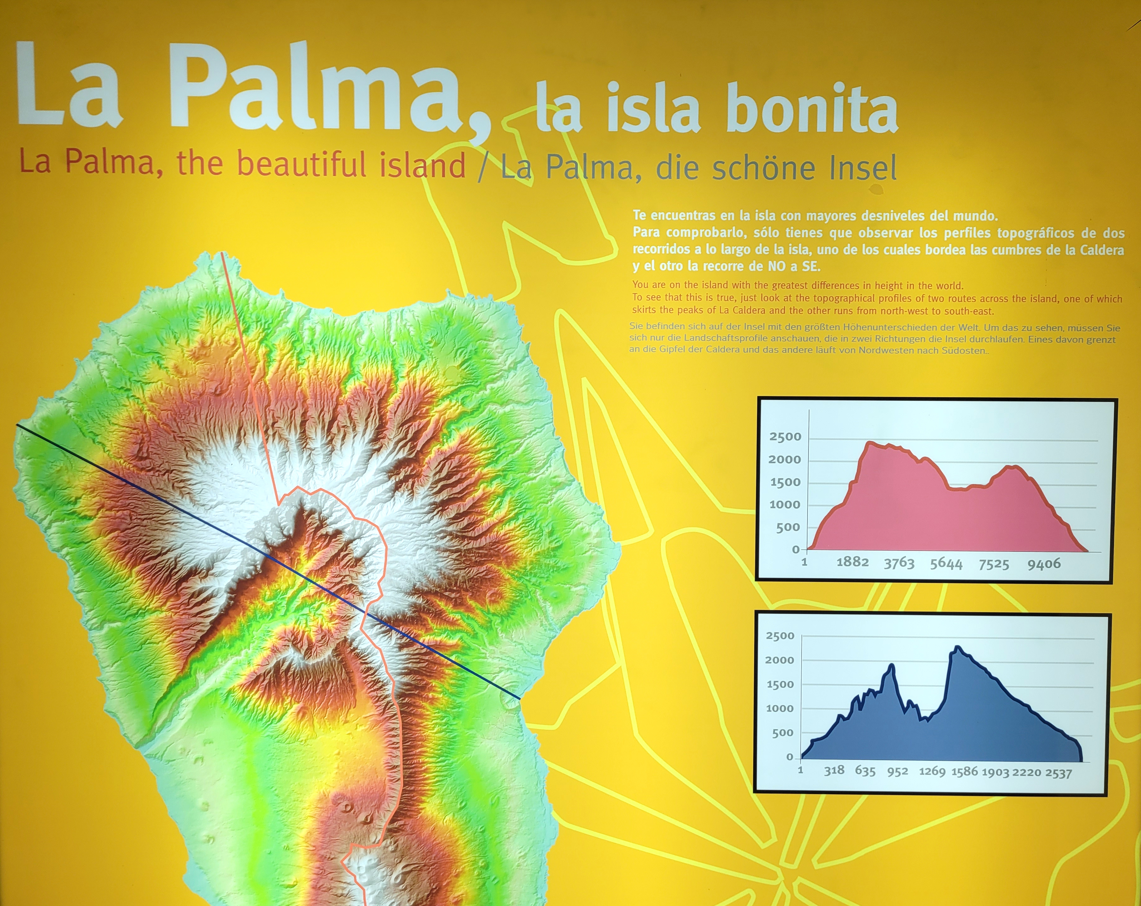 La Palma ist übrigens laut hochoffiziellem Visitorcenterschild die Insel mit den "größten Höhenunterschieden der Welt". Was immer das heißen mag, zum radeln passt's auf jeden Fall allerbestens. Werden heute am Ende des Tags wohl wieder an die dreitausend Tiefenmeter, damit kann man durchaus leben.