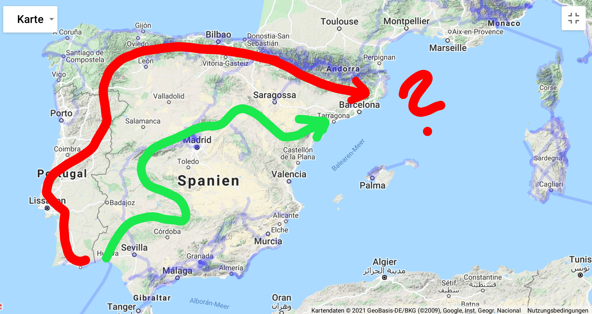 Ich bin für den grünen Pfeil. Meistens bekommt man von Spanien ja nur die Küsten zu sehen.