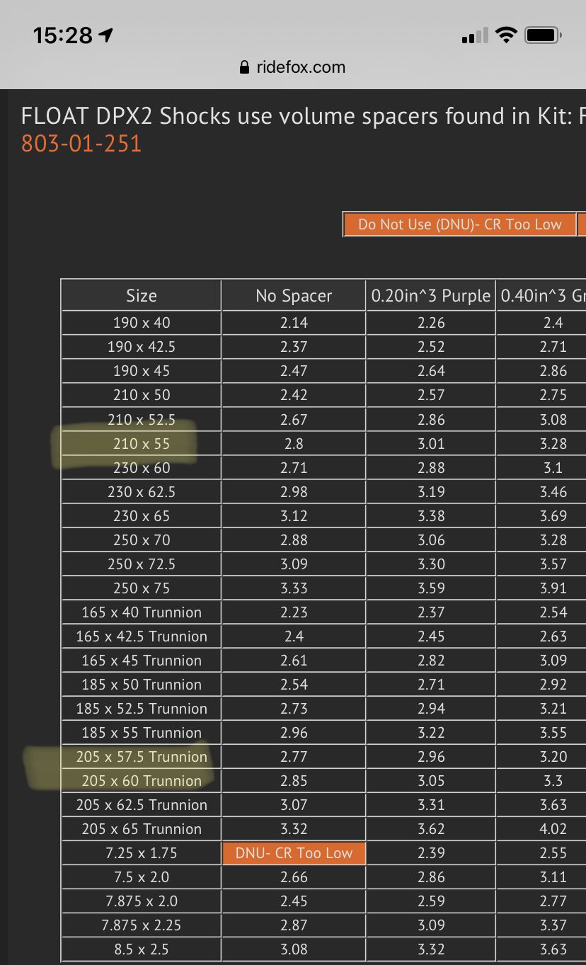 Das mit dem Gewicht wurde mir auch so erklärt, leuchtet mir aber nicht so ganz ein. Ist denn der größte Spacer bei deinem laut fox Tabelle erlaubt und Fox empfiehlt ihn trotzdem?