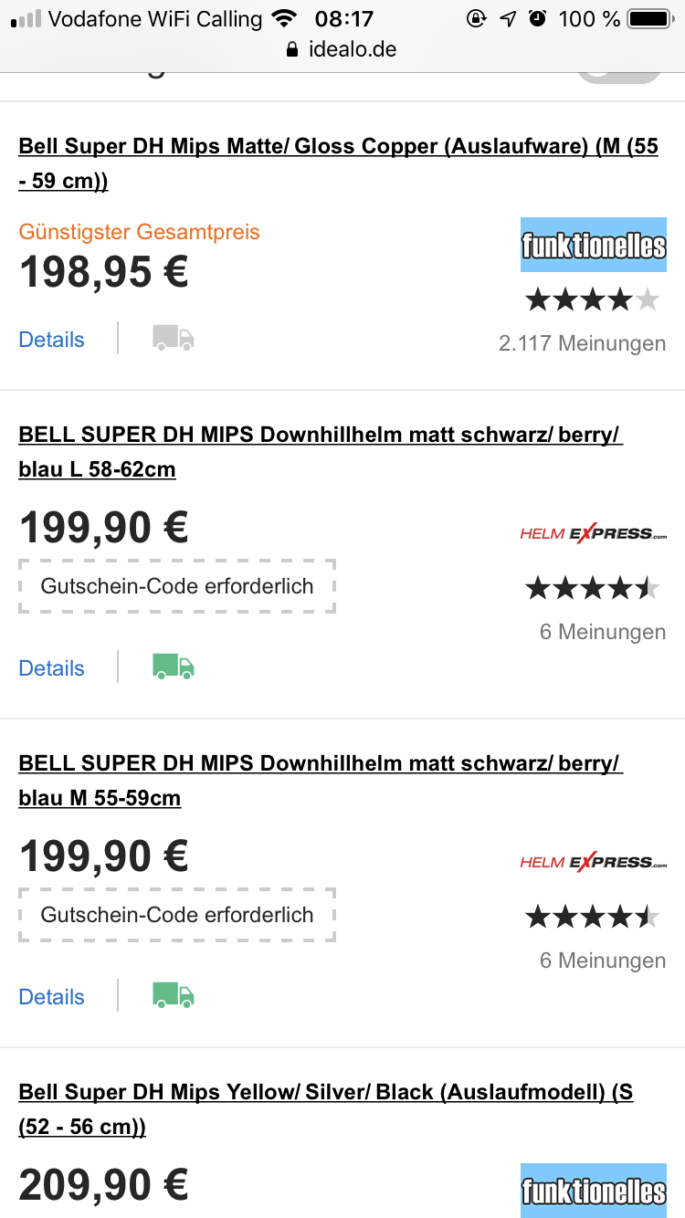 Wo? Finde nur den Super 3R für 199€, was nicht sonderlich günstig ist. Der Super DH steht mit 249 drin.Wer aktuell auf der Suche nach einem Bell DH ist, sollte mal bei Helmexpress.com vorbei schauen.