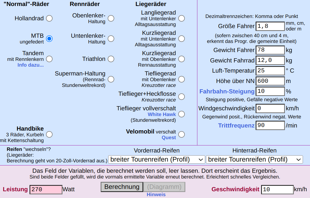 Ah ok. Gib mal 13kg Rad, 90 kg Fahrer (inkl. Klamotten, Rucksack, Getränk) ein, dann kommst Du da schon bei 309 W raus. Und das ist idealisiert; ich fahre Fully, Bodenbeschaffenheit war 1/3 Asphalt, 1/3 grob/geröllig/steil mit Stufen, 1/3 Pflaster... dann rutscht man in die Grenzbereiche. Also ja: Für Rekordversuche besser schnurgerade Asphaltstrecke hernehmen...
