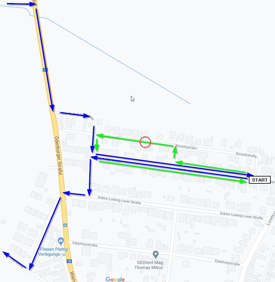 Geil das klappt, dachte ich ... aber dann ... er hat mich nach der Abbiegung nicht weiter entlang der blauen Strecke geschickt (ich hätte nach links unten müssen) sondern gleich wieder die nächste Gasse zurück zum Startpunkt. :spinner: