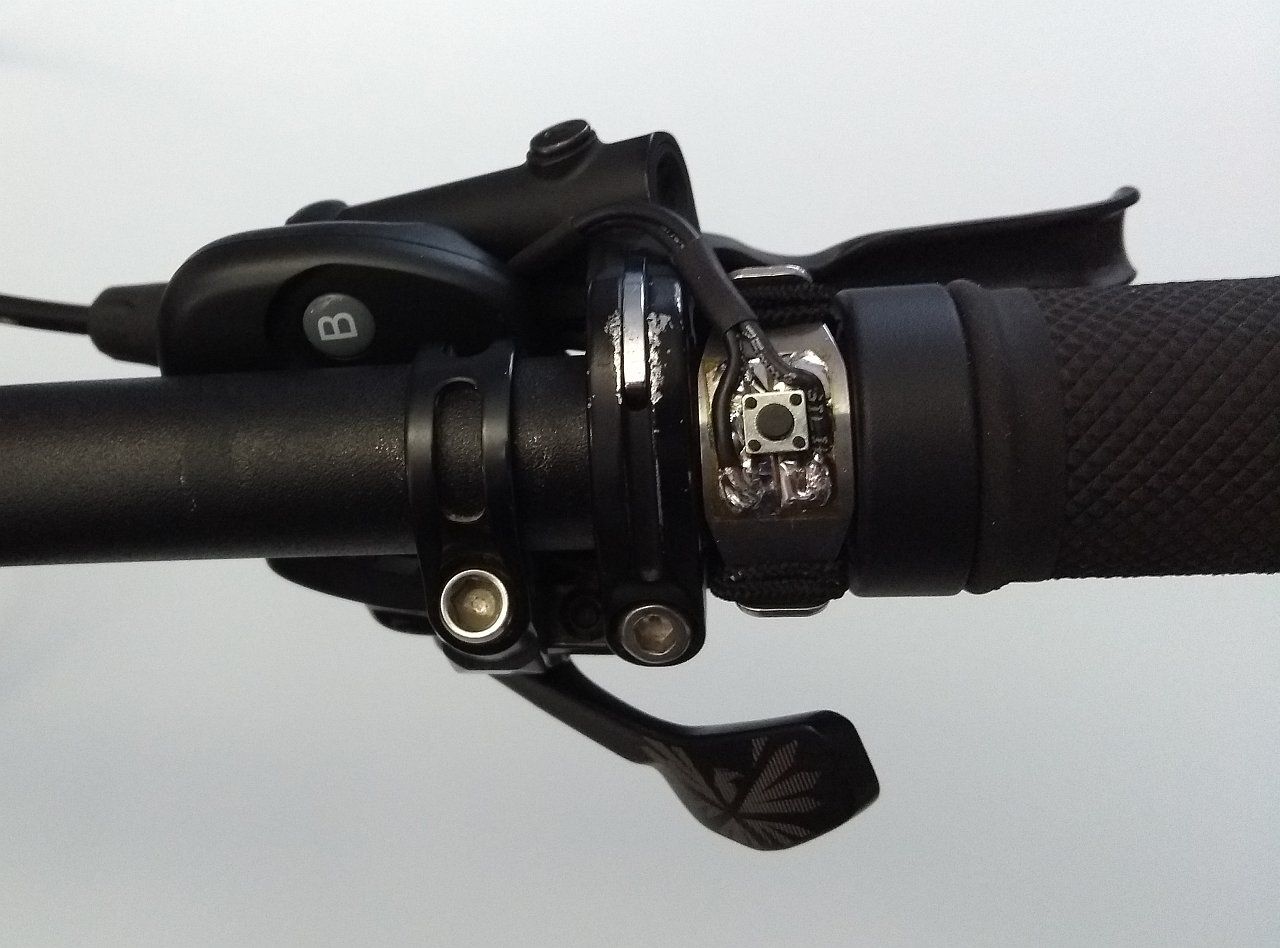 Hier ist mein Prototyp für einen Lenkertaster. Direkt nebem dem Griff sehr gut erreichbar und drehbar, um eine optimale Position zu finden. Der Sender kann zum Beispiel zwischen Bremshebel und Lenker verstaut werden -oder mit längerem Kabel am Vorbau.