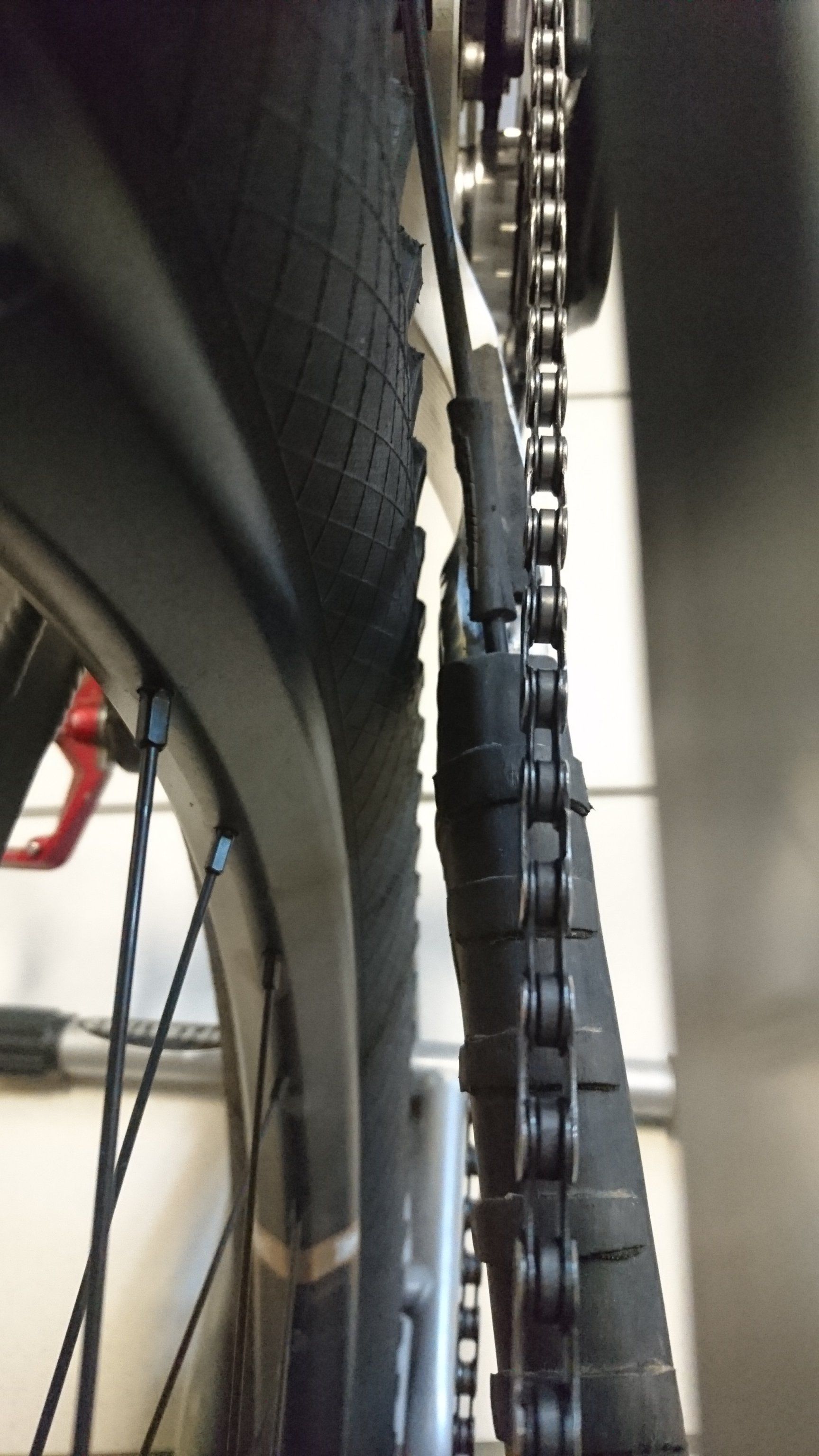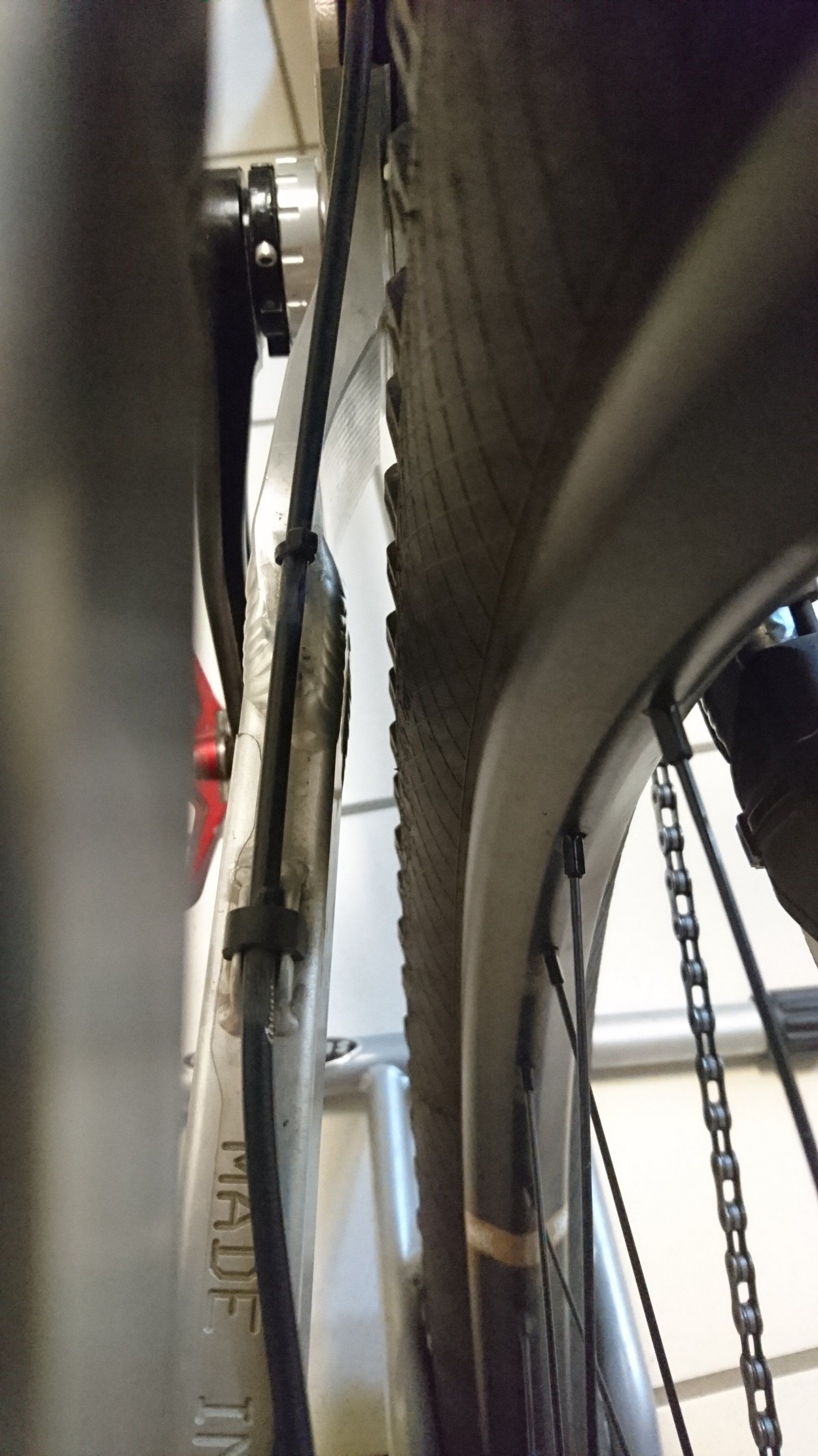 Auffällig ist auch, dass der Reifen zur Kettenstrebe und zur gegenüberliegenden Seite einen deutlich verschiedenen Abstand aufweist. Das Rad an sich scheint aber mittig im Rahmen zu sitzen (und der Reifen gerade auf der Felge).