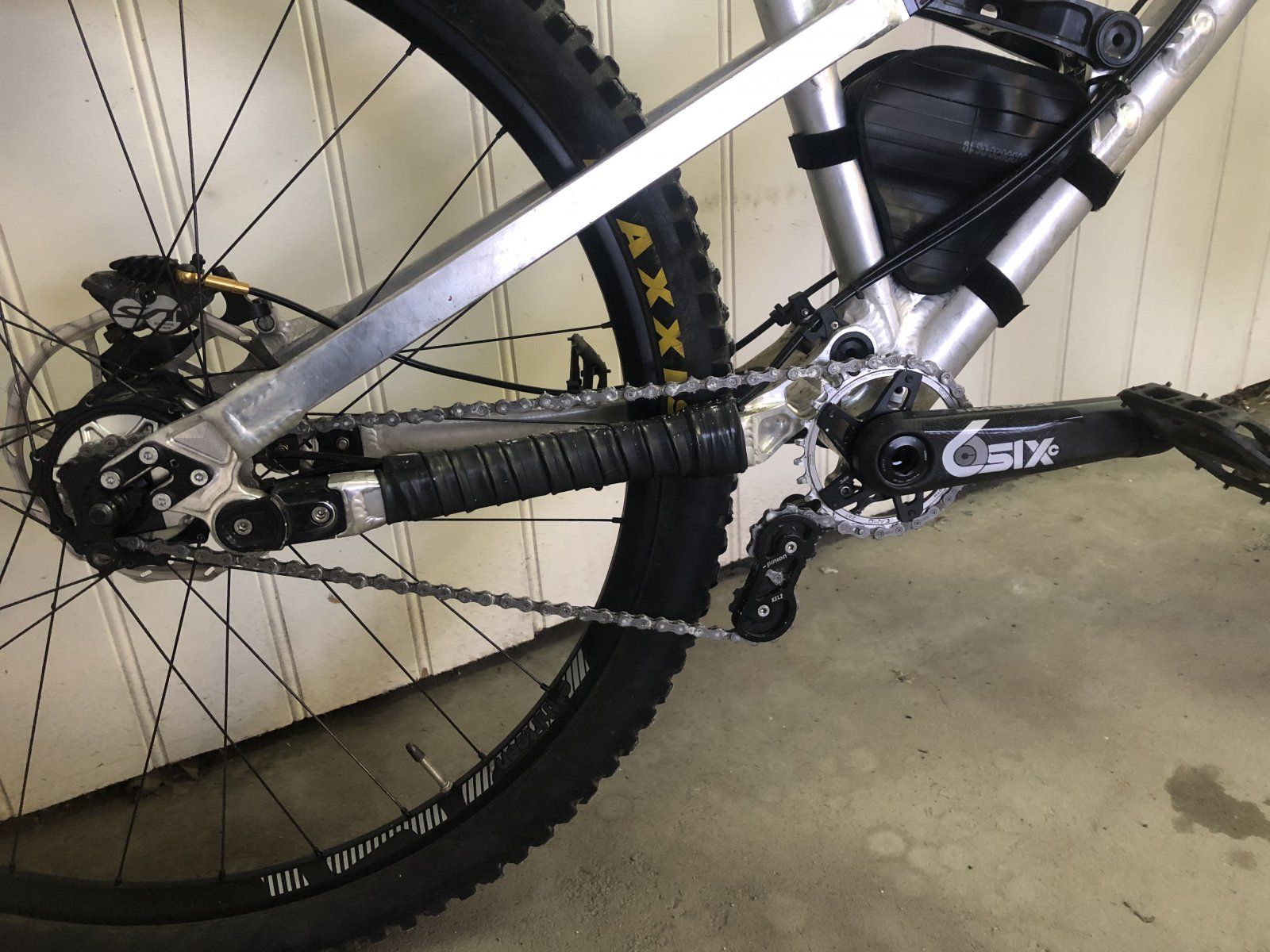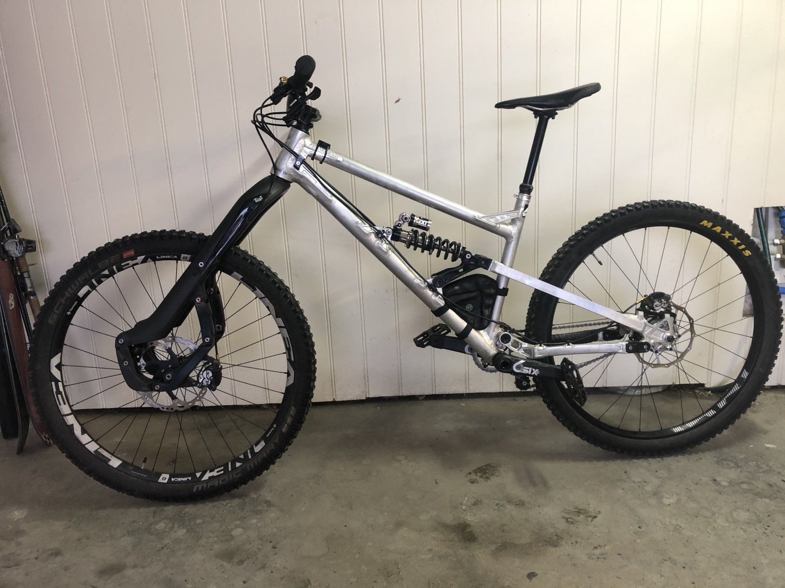 G1, large mit EXT Storia, Trust Shout, Shimano Saint Bremsen, Kindernay XIV 14 Gangnabenschaltung mit Sapin Speichen und E13 TRS+ 29" Felge, RF SixC 165mm Kurbeln, Rotor Stahl Innenlager, Bontrager Plastikpedale, Formula Linda G 29" Vorderrad, Pinien Kettenspanner, Wotftooth Camo Spider mit 28t Stahlkettenblatt, Magic Marry EVO Super Gravity und Minion DHRII EXO casing, alles mit Schlauch.
