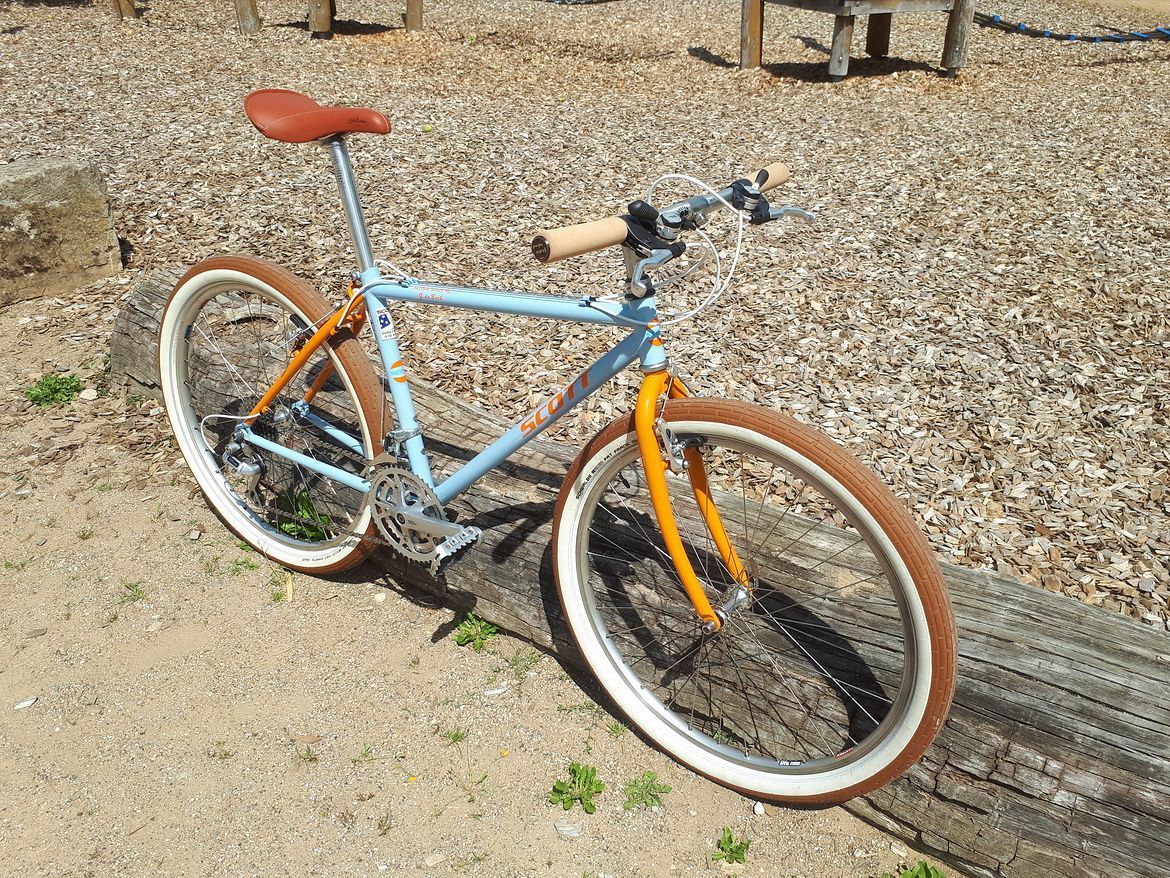 sieht gut aus! sind denn rahmenfarbe und decals original? ich kenne das rad nicht, obwohl ich ein totaler scott-nerd bin...vllt. eine us-ausführung?