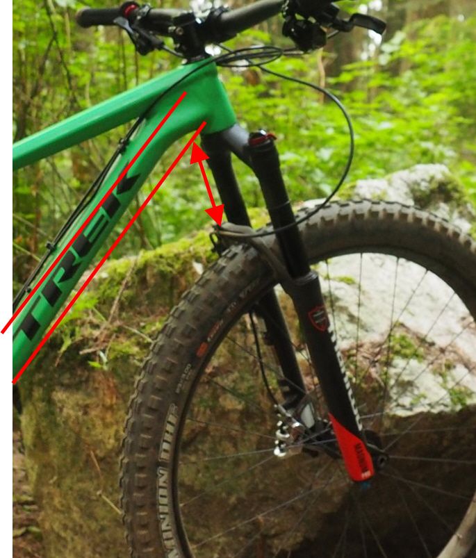 Die Manitou Gabeln federn maximal so ein, dass die Gabelbrücke noch deutlich unterhalb des oberen Endes der Gabelkrone ist.